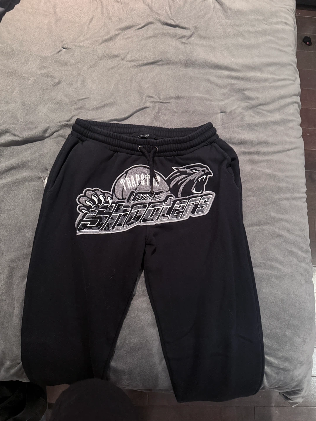 Selling a pair of Trapstar London Shooters sweatpants! They're black and feature the iconic Shooters logo. Great for lounging or streetwear.