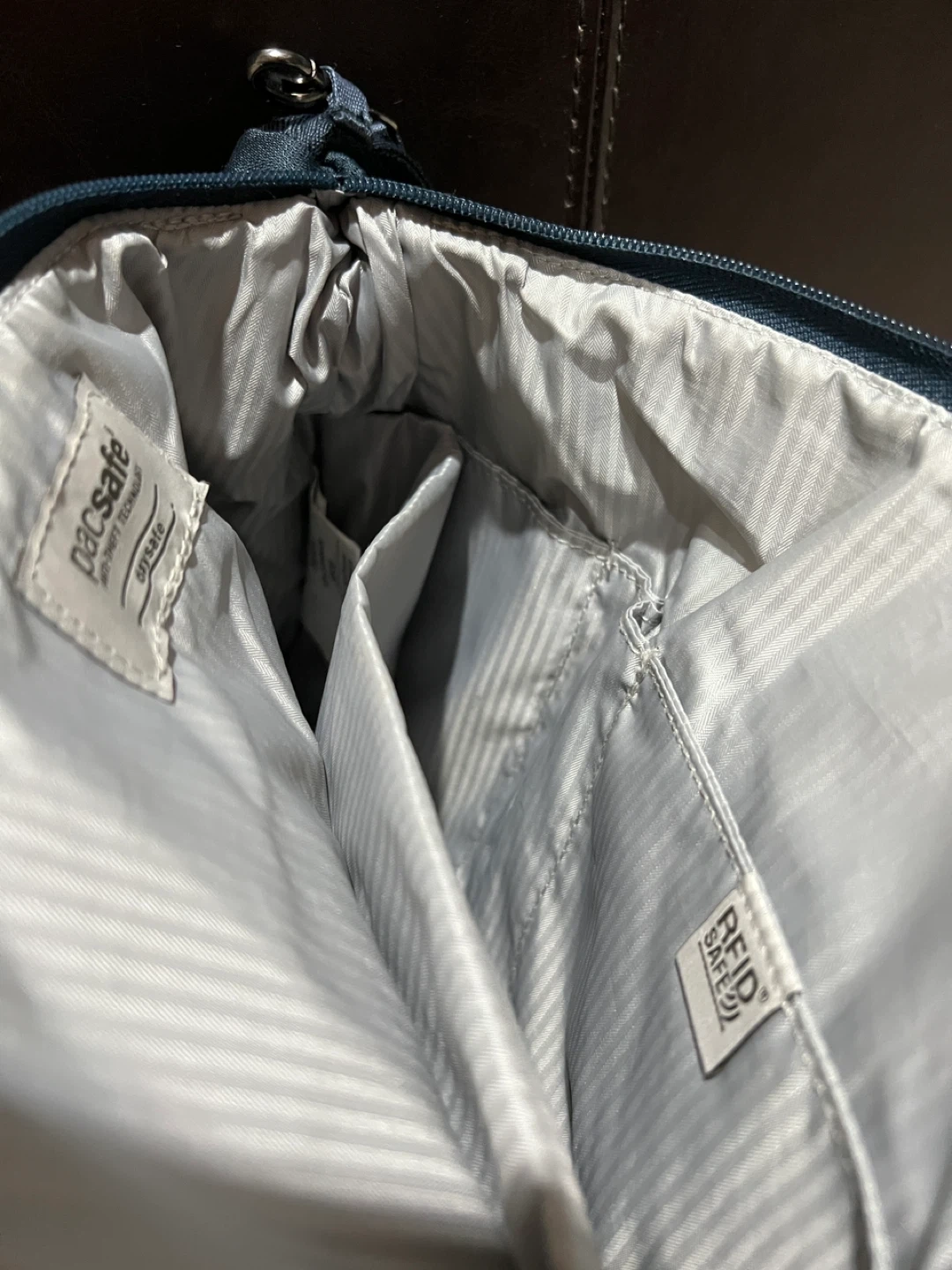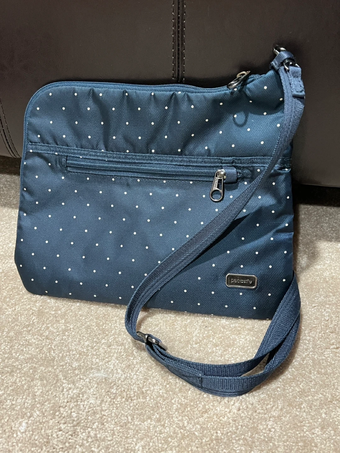 This Pacsafe crossbody bag is in superb condition and ready for a new adventurous traveller! It's a stylish navy blue with white polka dots. The bag features RFIDsafe blocking technology to keep your information secure. Separator to keep things organized. Two cell phone pockets inside and a zipper pocket in the front for quick access. Perfect for travel or everyday use!