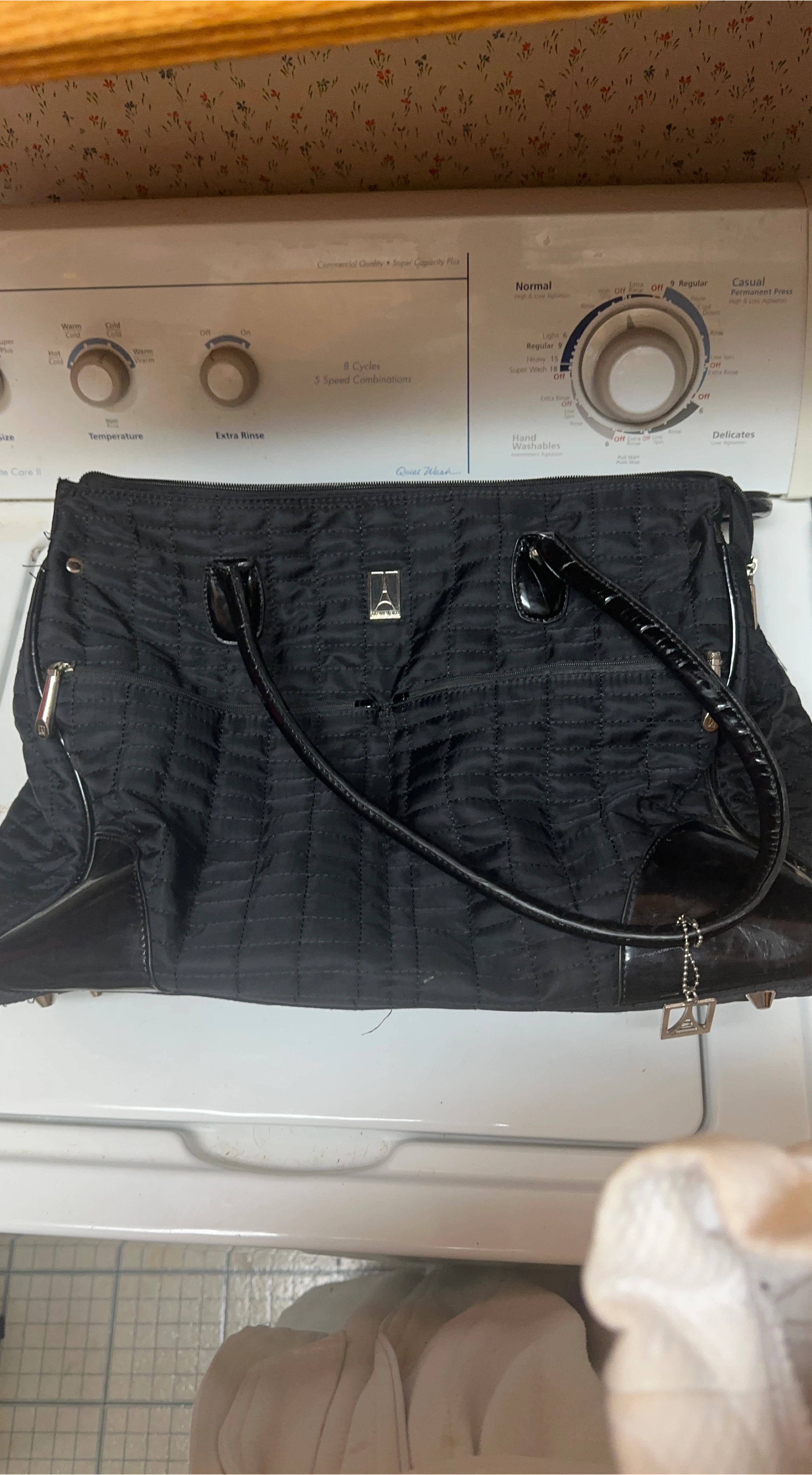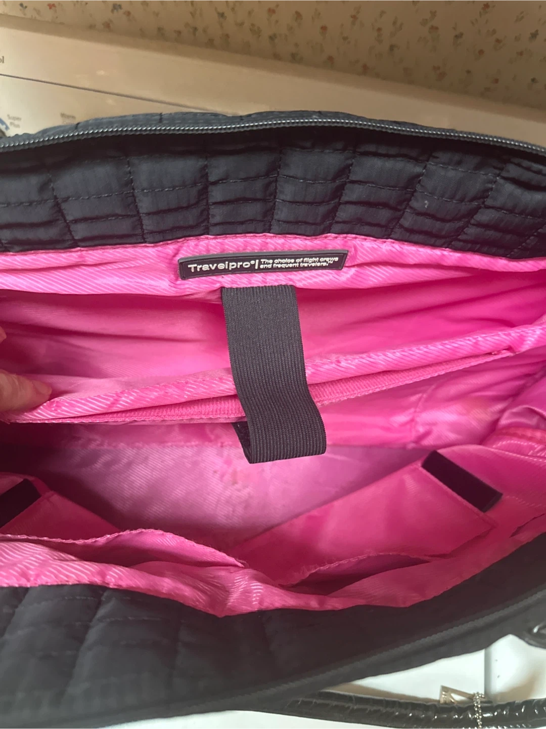 60This is a Travelpro tote bag in black with a quilted pattern. It features a pink interior lining. The bag is in good condition and ready for a new owner! RFID blocking technology. Retails for $140 can