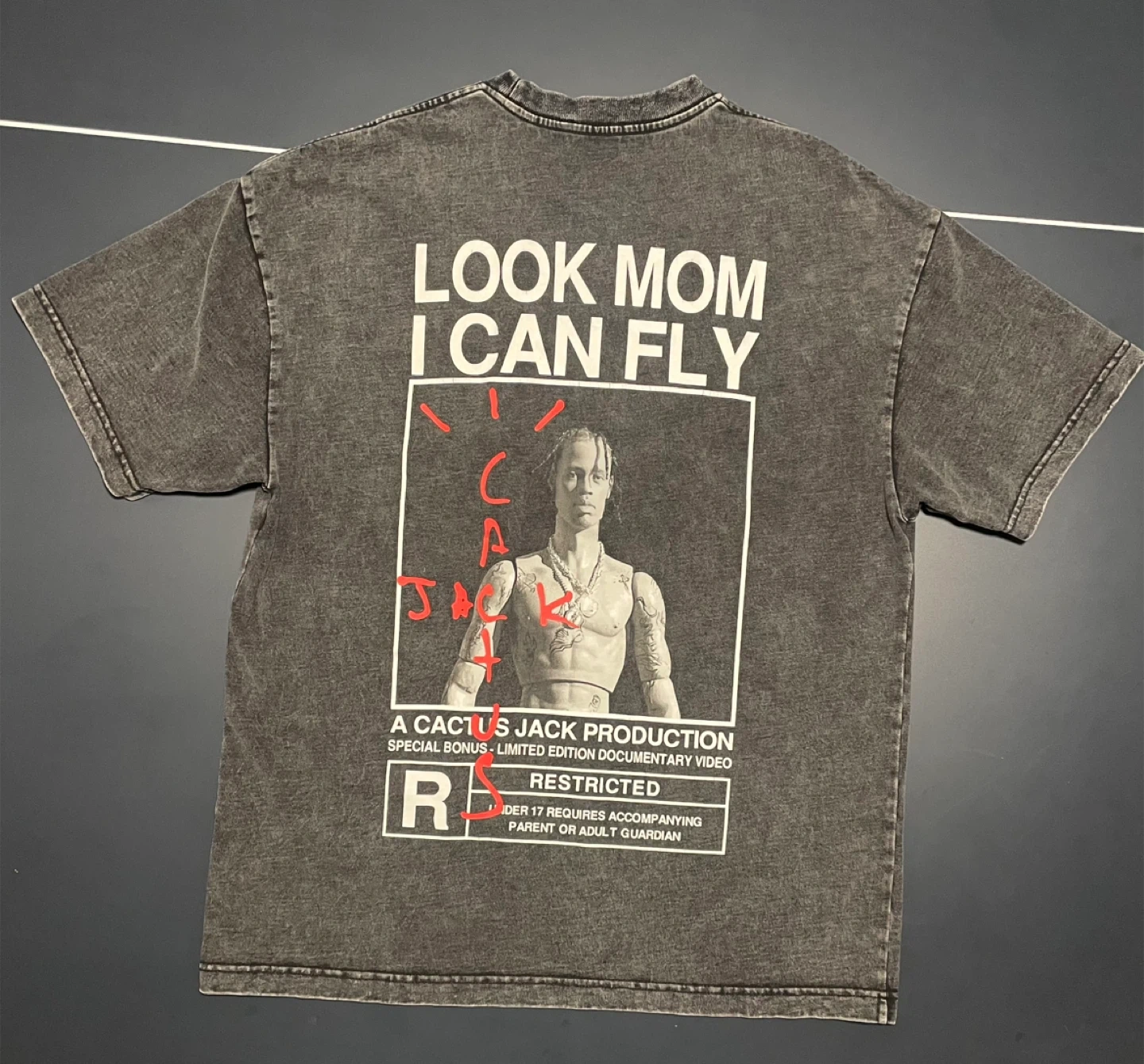 10Cactus Jack T-shirt featuring a washed black colour and the "Look Mom I Can Fly" graphic on the back