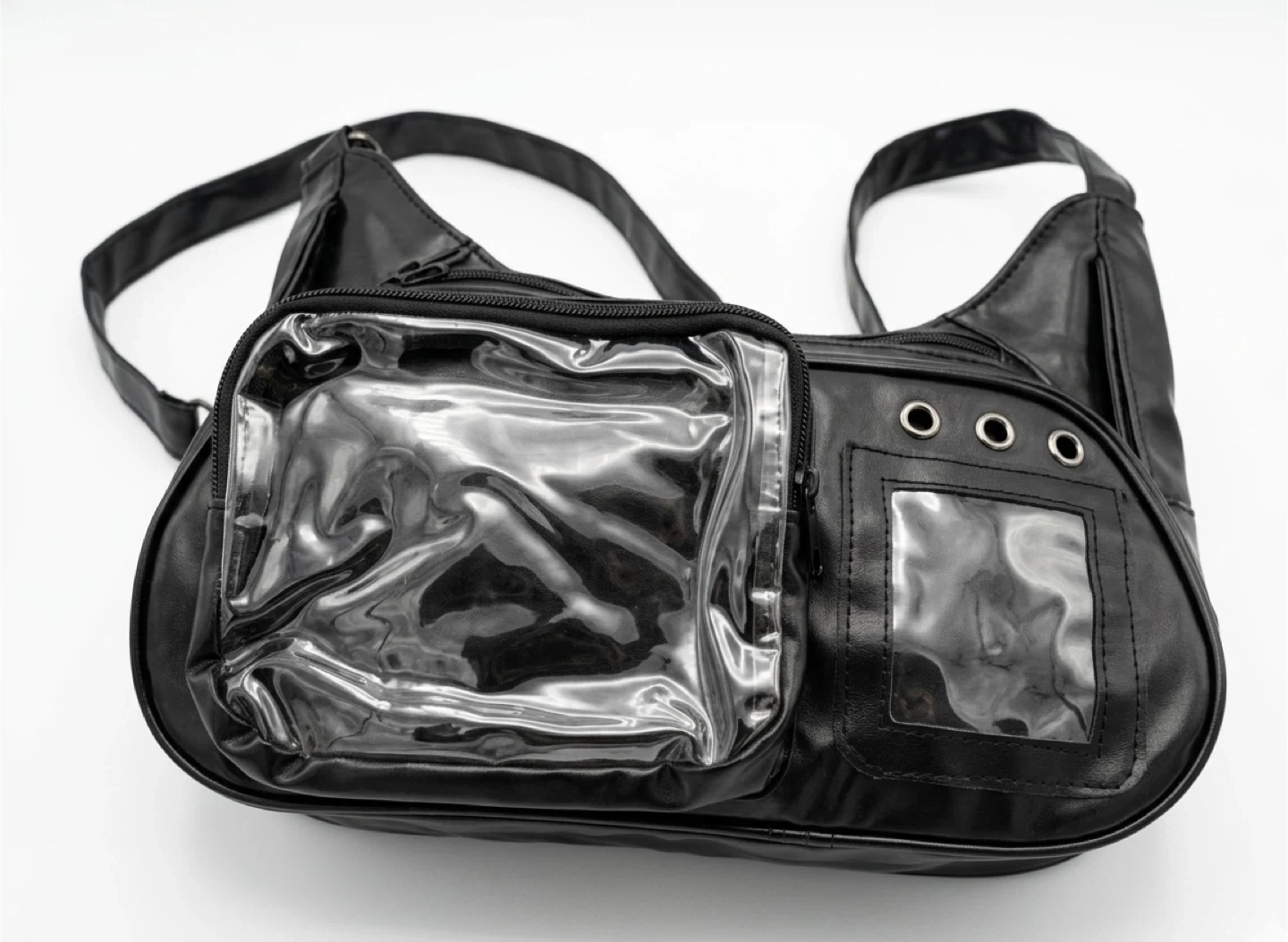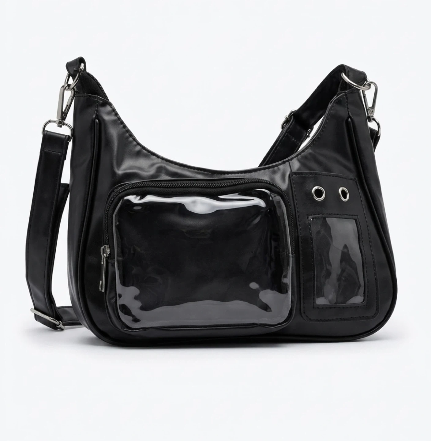 ITA bag, shoulder bag is made from faux leather. It features clear display pockets on the front for showcasing items. The bag has a zippered main compartment and an adjustable strap.