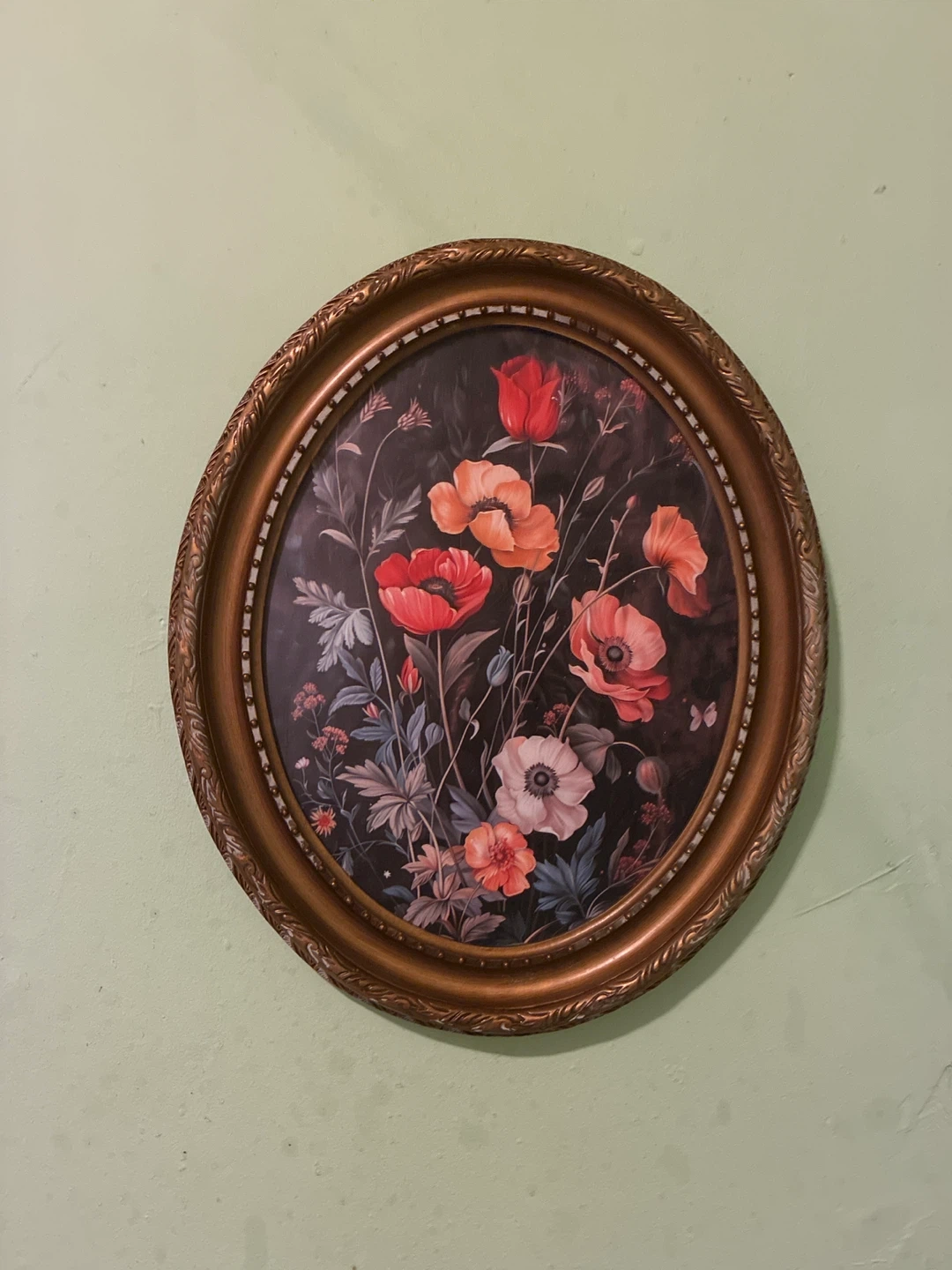 Vintage oval framed print featuring a vibrant floral arrangement. The frame has a detailed, ornate design in a gold-tone finish. It's ready to add a touch of classic beauty to any room!