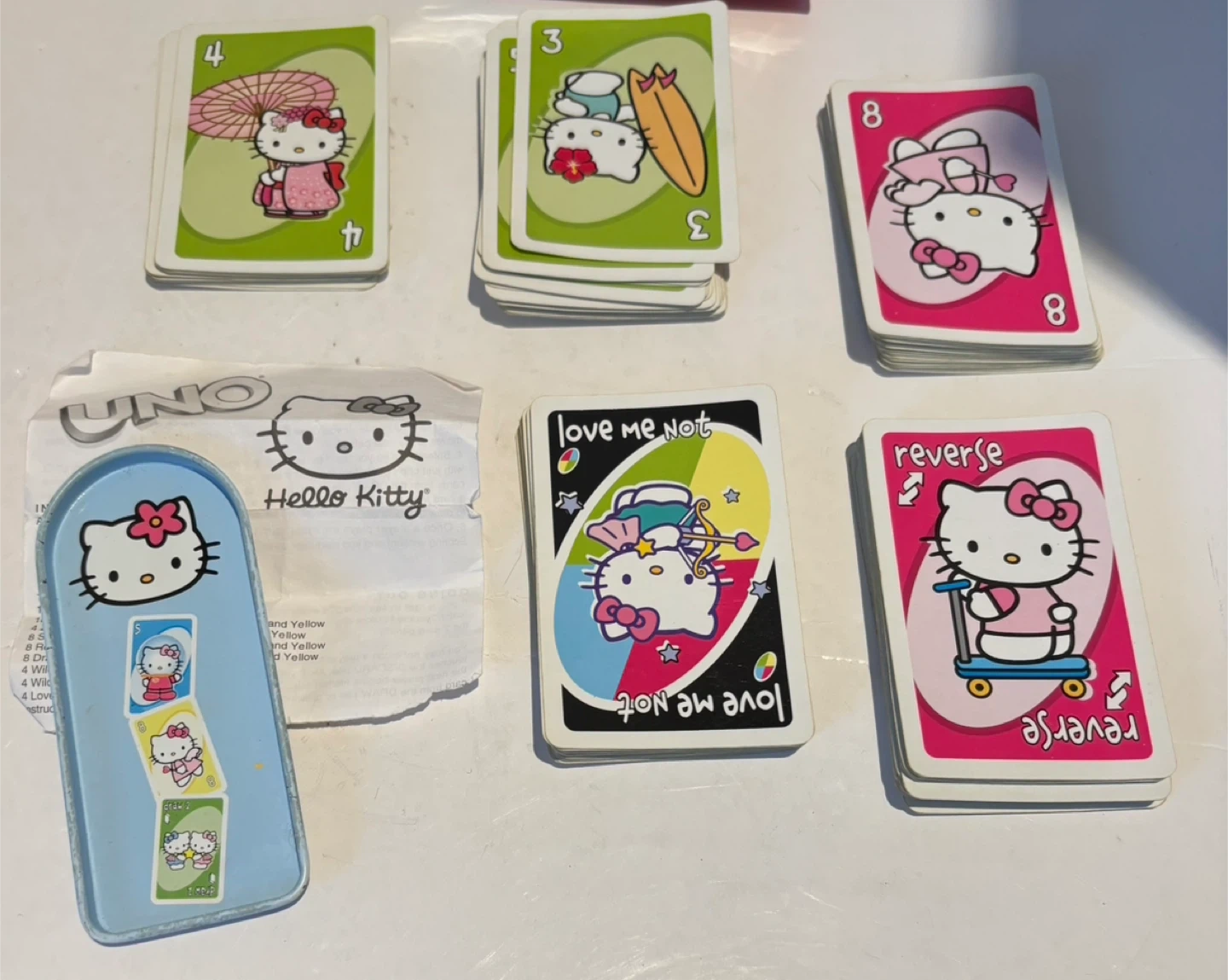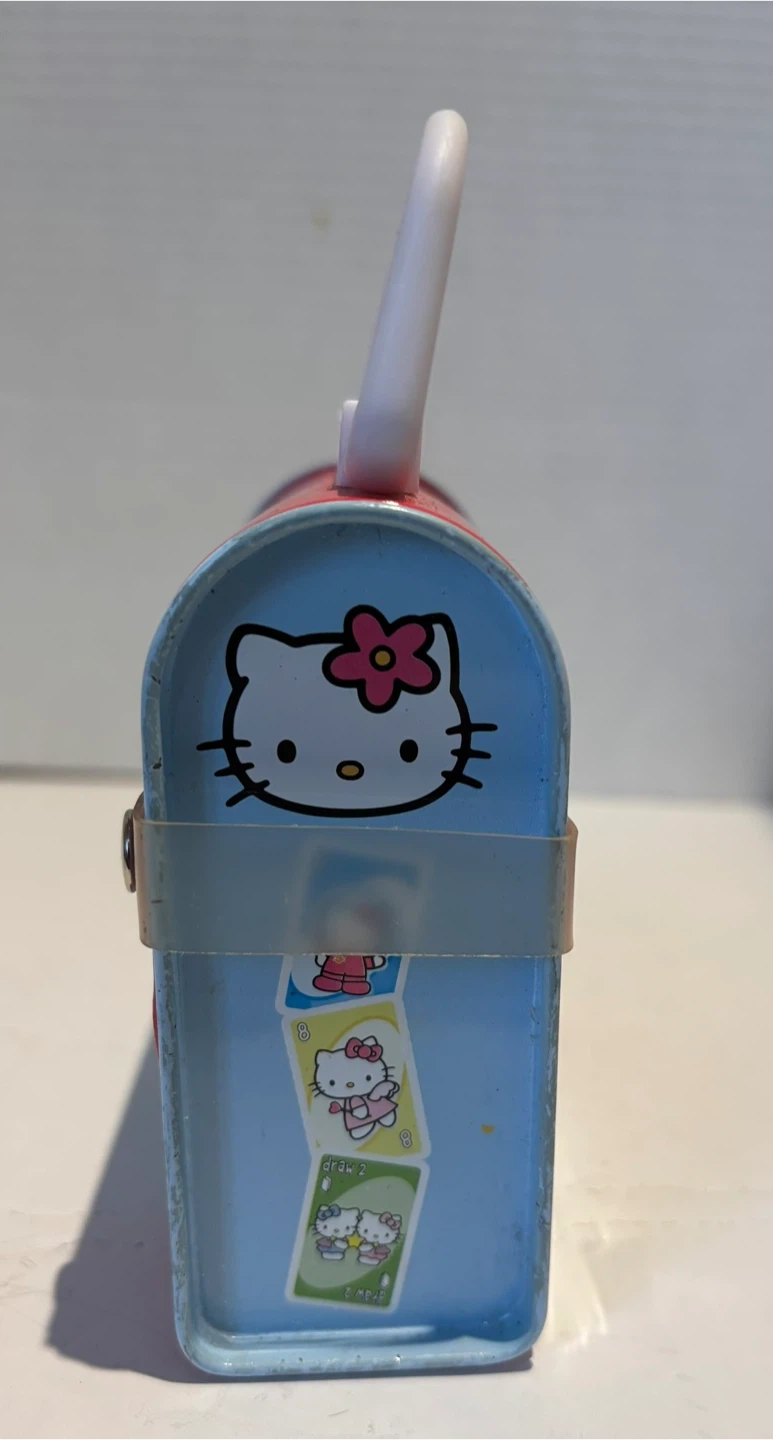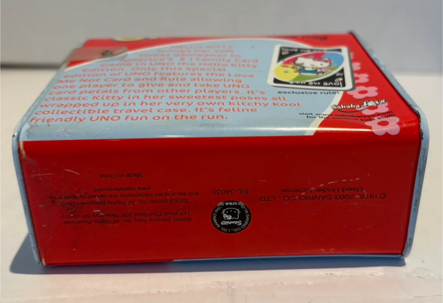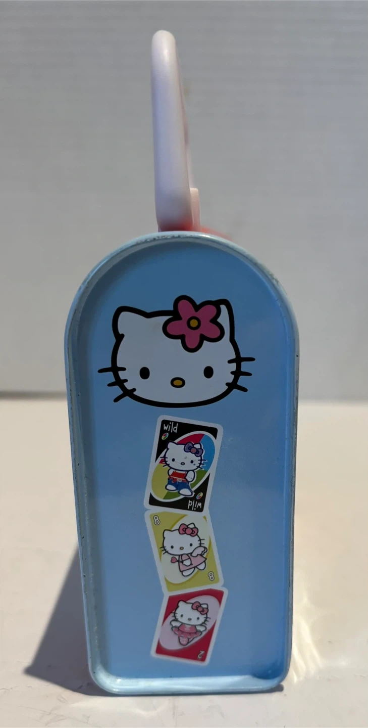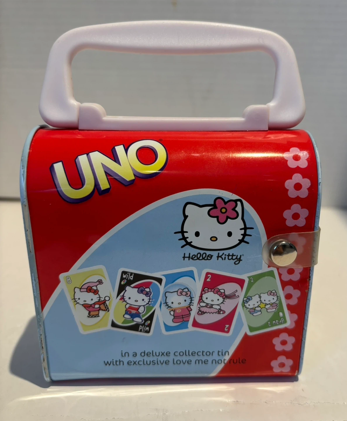 This is the Hello Kitty UNO Deluxe Collector Tin edition! It includes the UNO deck and a special "Love Me Not" card. Perfect for Hello Kitty fans and card game lovers alike. Tin has a handle for easy carrying. Vintage Hello Kitty Uno Deluxe Collector Tin Sanrio 2003 Complete w/Instructions