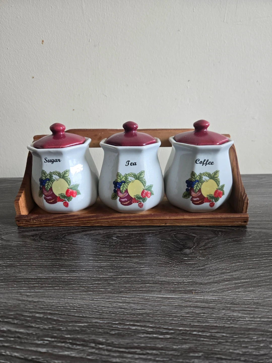 White ceramic canister set with dark red lids, perfect for storing sugar, tea, and coffee. Each canister has a fruit and berry decal. They come with a wooden caddy for display. They're great for keeping your kitchen counters tidy!