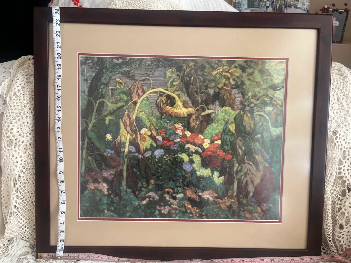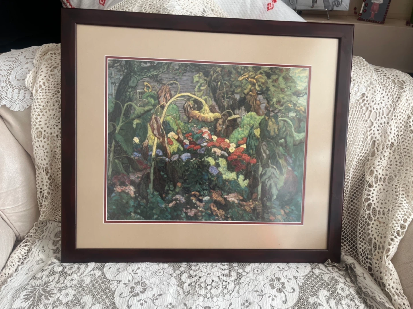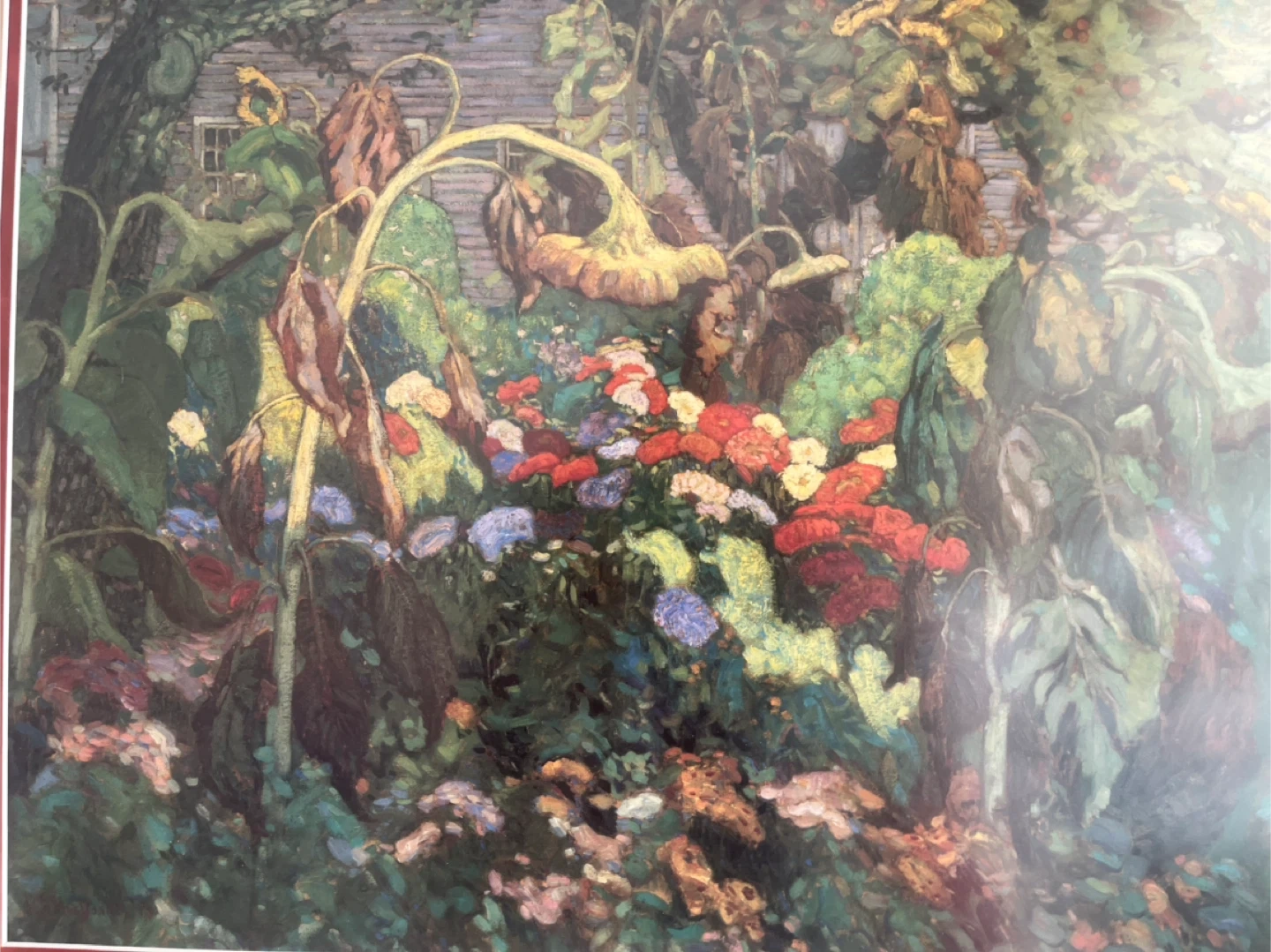 Framed print featuring a lush garden scene with vibrant sunflowers and assorted flowers. The image is an important in Canadian art. It is of a painting done in 1916 by JEH MacDonald, a member of the famous Group of Seven.