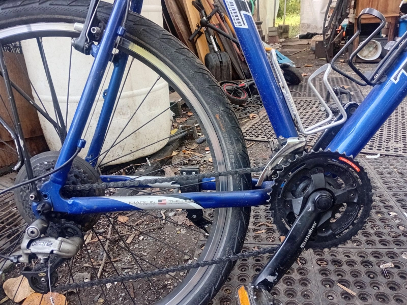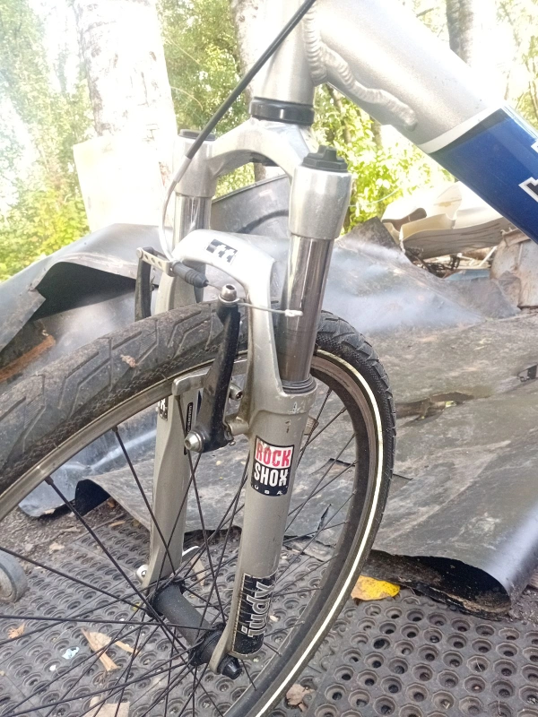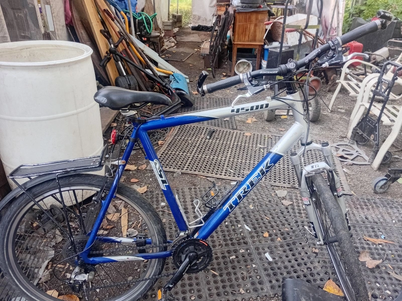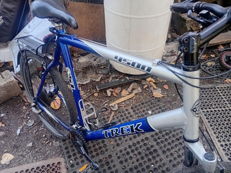 Selling a Trek 4500 mountain bike in blue and silver. It has a Rock Shox front suspension and a water bottle holder. It's ready for some off-road adventures!