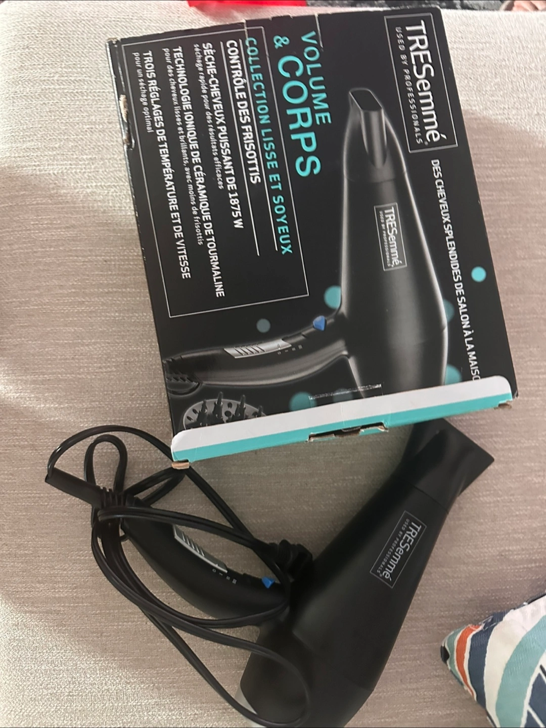 Selling a TRESemmé Volume & Corps hair dryer. It's in excellent condition and comes with the original box! This hair dryer has a powerful 1875W motor and ceramic tourmaline technology for smooth, frizz-free results. It also features three heat and speed settings for customized styling