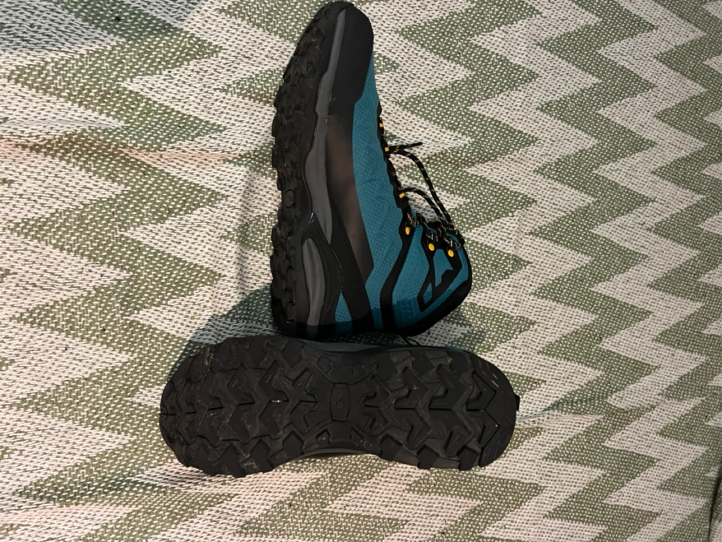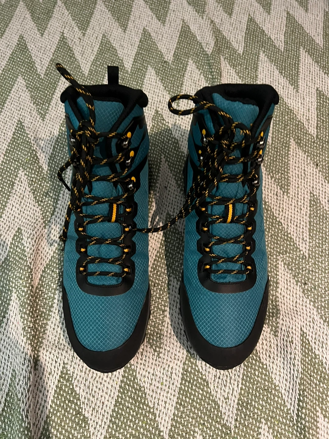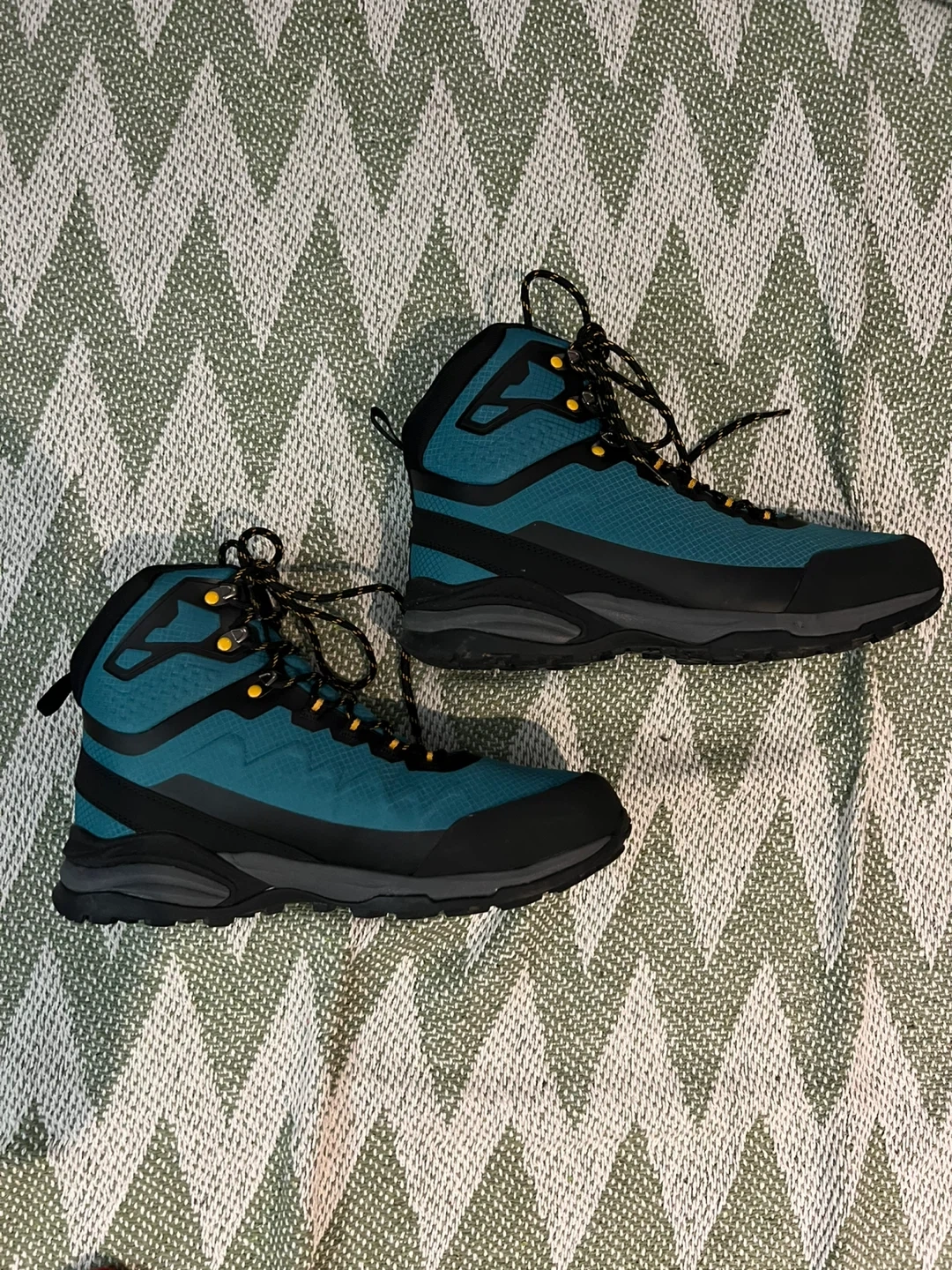 These Trespass hiking boots are in great condition and ready for your next adventure! They're a nice teal colour with black accents and yellow detailing on the laces and eyelets. Perfect for hiking or just getting around town in style