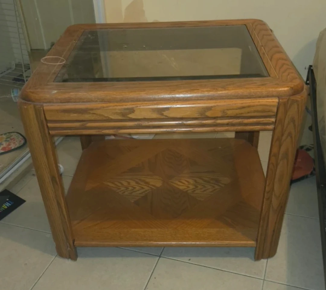 Selling a wooden end table with a glass top. It has a classic design with a lower shelf for storage or display. The table shows some signs of wear, but it's still sturdy and functional. Perfect for a living room or bedroom!