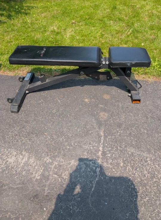 Weight bench, with an adjustable back and seat, perfect for all types of exercise. Black padded surfaces. Steel frame.could use some TLC, metal legs have some rust on the inside, the leather was detached from the base could use some good old staple gun and would be tight again