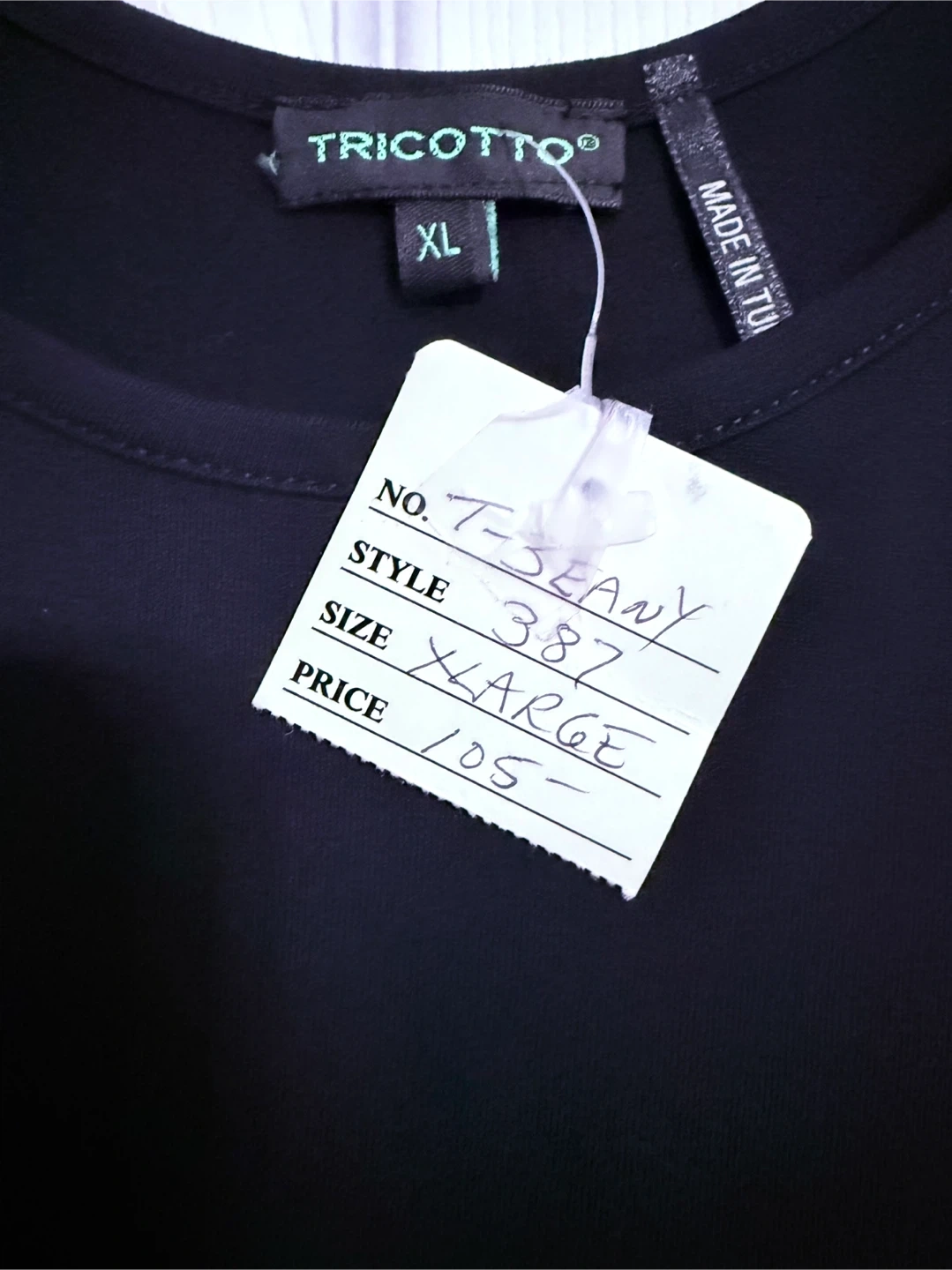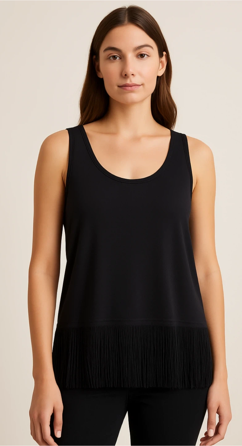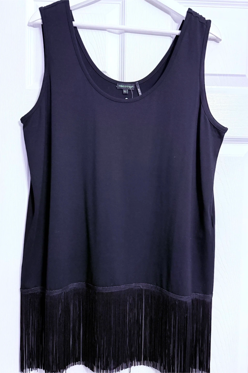 442This is a Tricotto black tank top with a fun fringe detail at the bottom. It's a size XL and made of 95% viscose and 5% elastane. Originally bought for $105! Ptp 22” stretches to 24” Length 32”