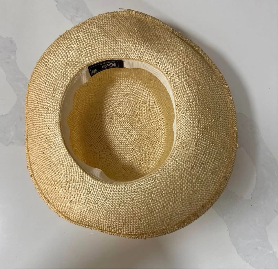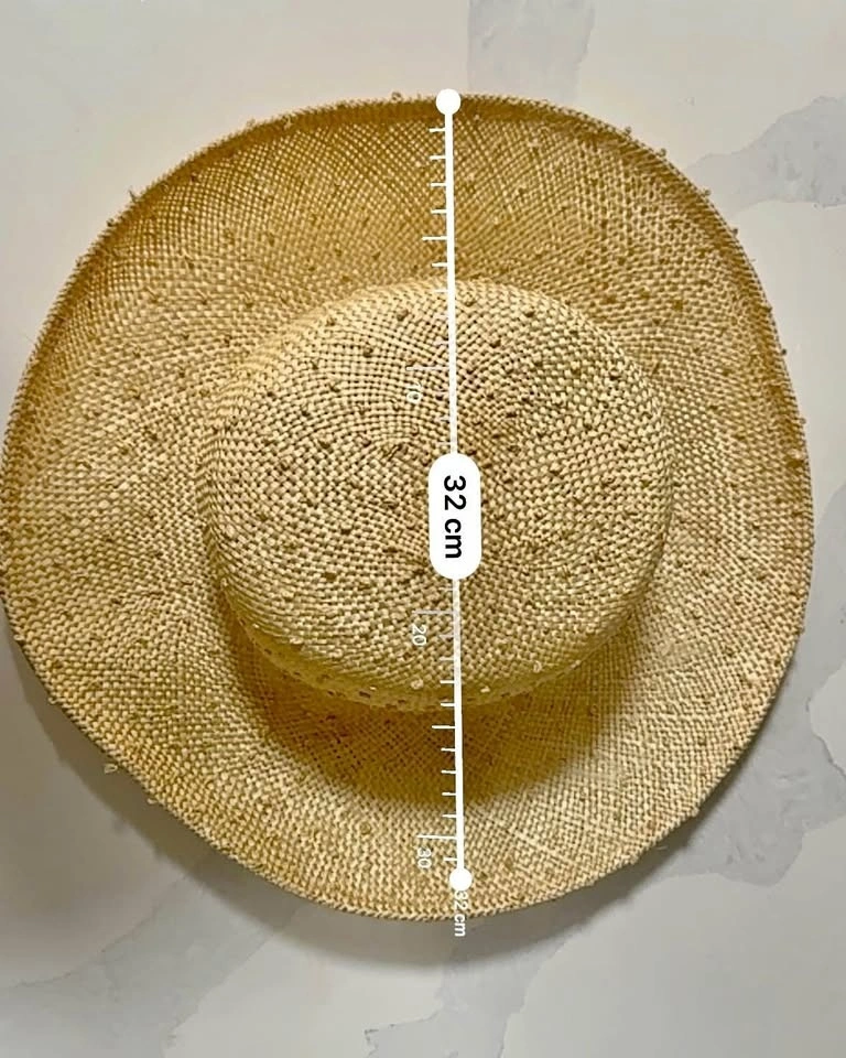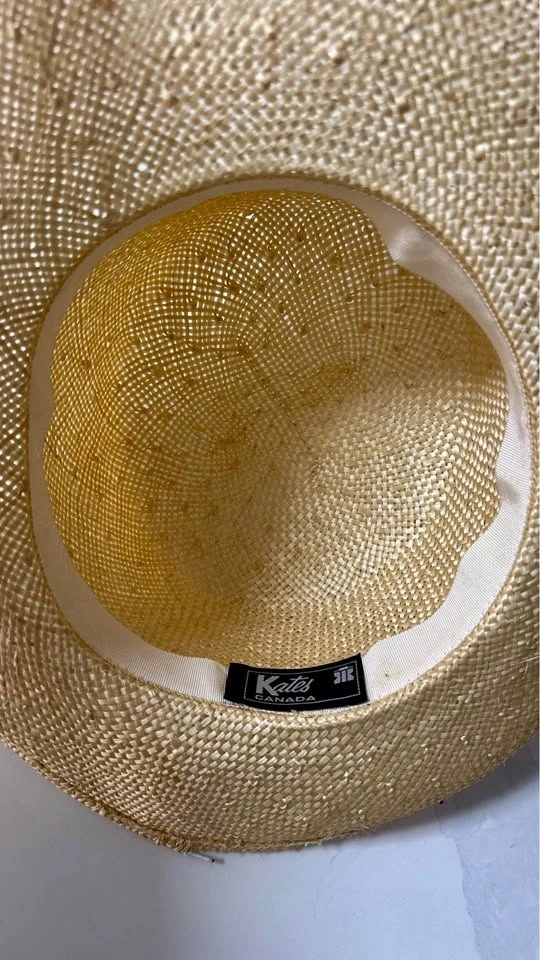 Stylish straw hat from Kates Canada with a wide brim. Total diameter is 32 cm. Inner head opening is 18 cm. Great for sunny days.