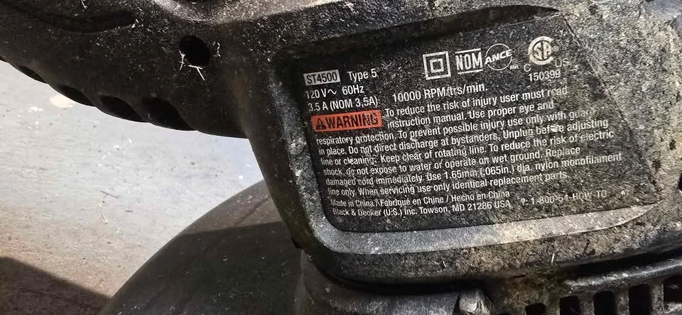 6010000 RPM/trs/min. 150399 ST4500 Type 5 120 V~ 60Hz 3.5 A (NOM 3,5A) instruction manual. Use proper eye protection to prevent possible injury. Use only with guard in place before adjusting. Do not direct discharge at bystanders. Unplug before cleaning. Keep clear of rotating line. To reduce the risk of electric shock, do not expose to water or operate on wet ground. Replace wet or damaged cord immediately. Use 1 line only. When servicing, use only identical replacement parts.