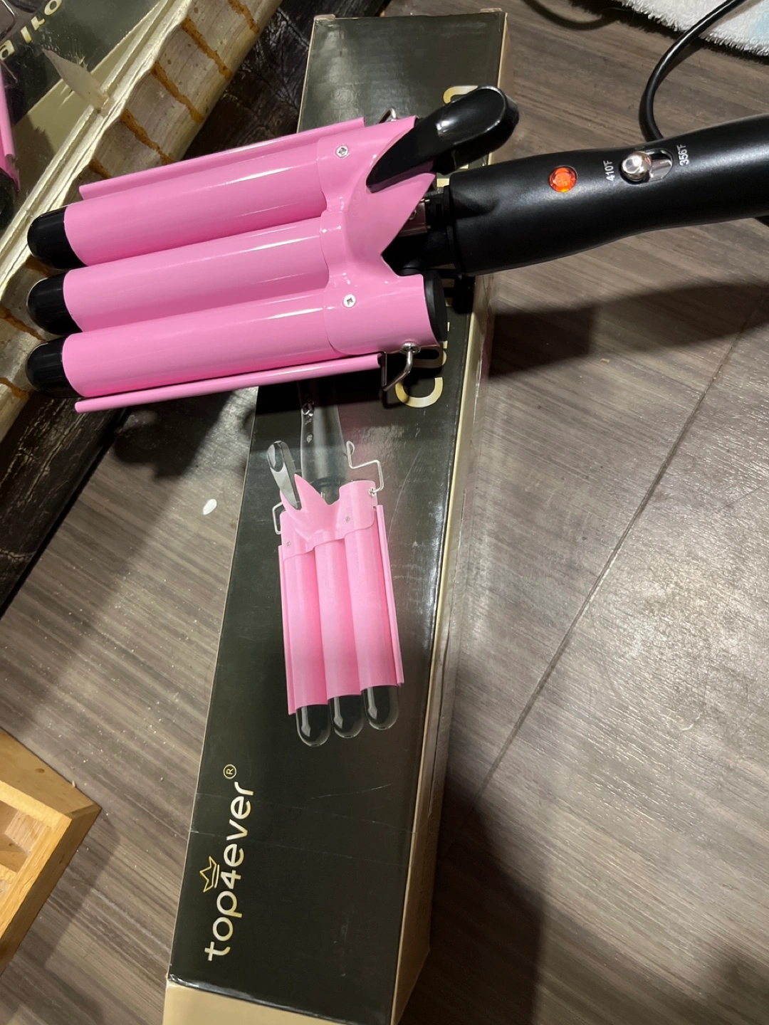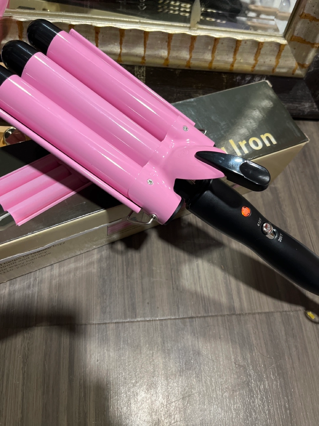 68Pink triple barrel curling iron. New in box. Great for creating voluminous curls and waves. Features on/off switch and heat settings.