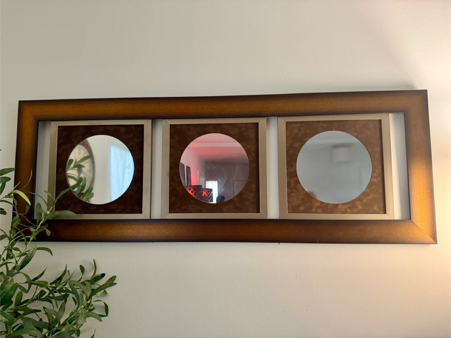 Selling a lovely piece of wall decor featuring three circular mirrors set in a rectangular frame! It's in great condition and would add a touch of elegance to any room