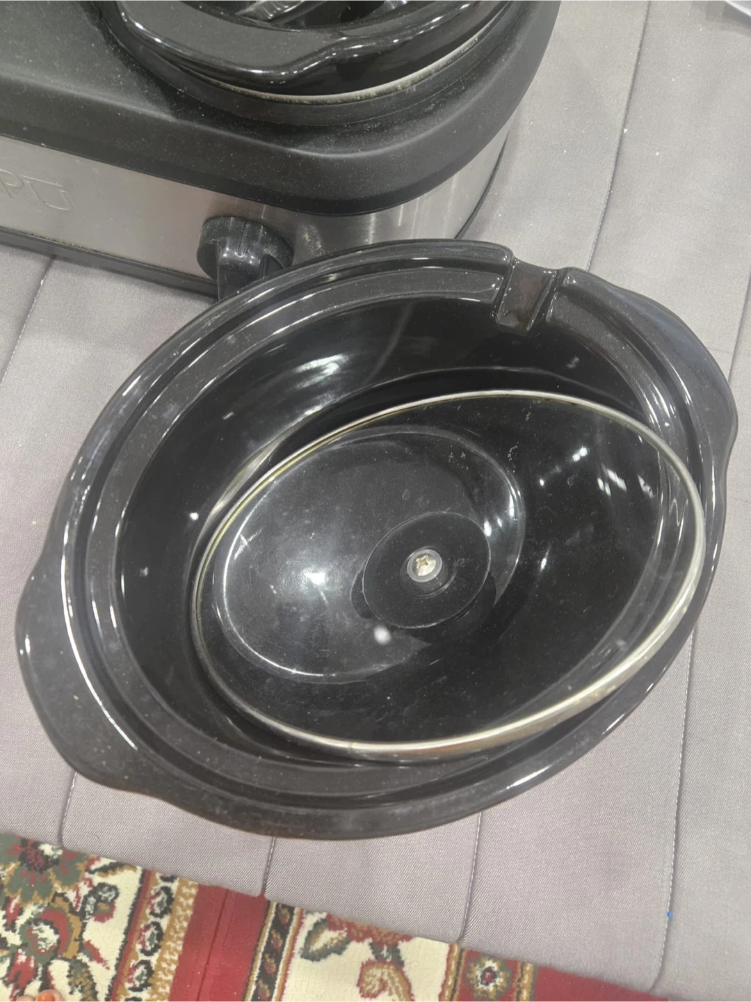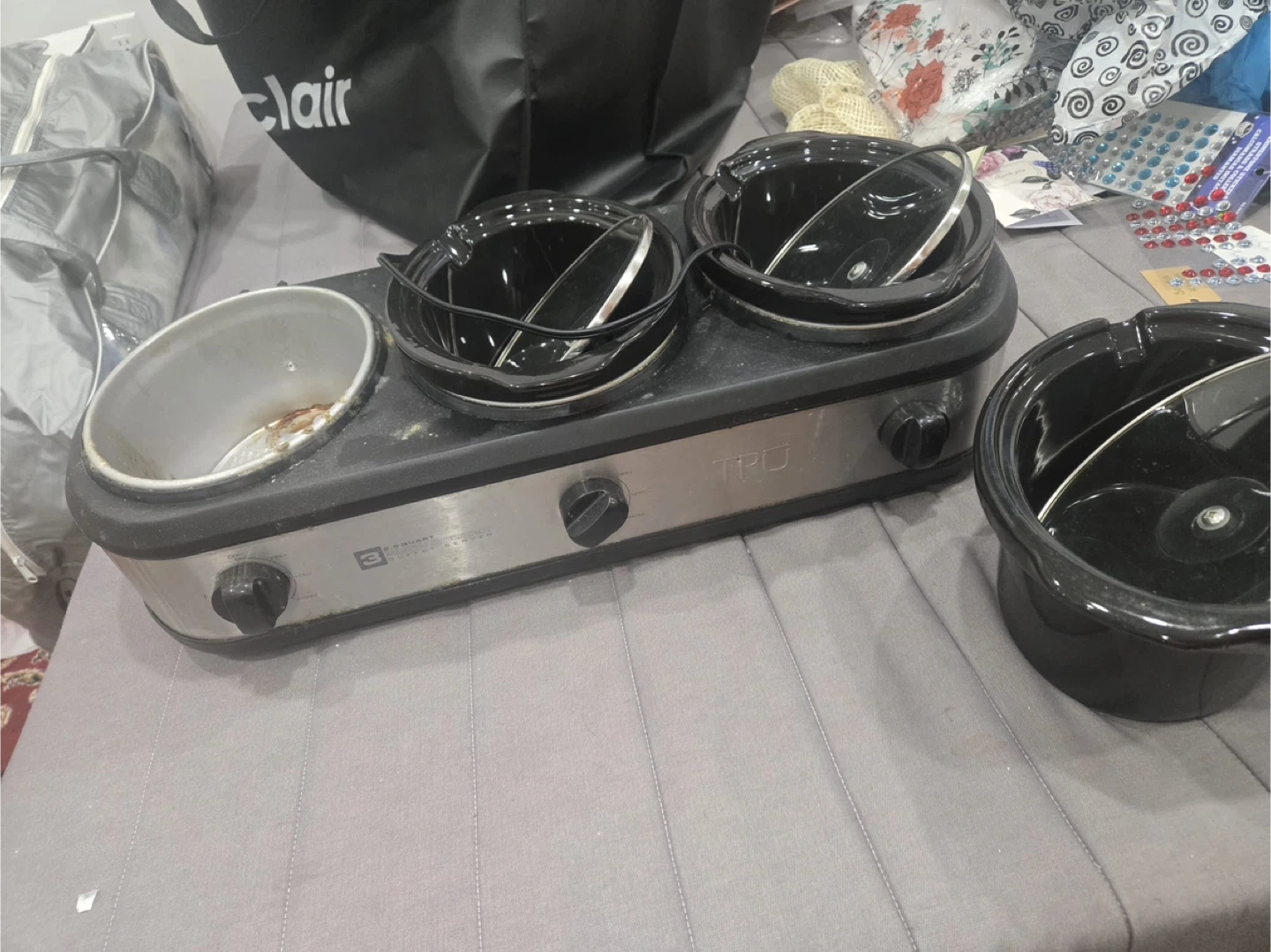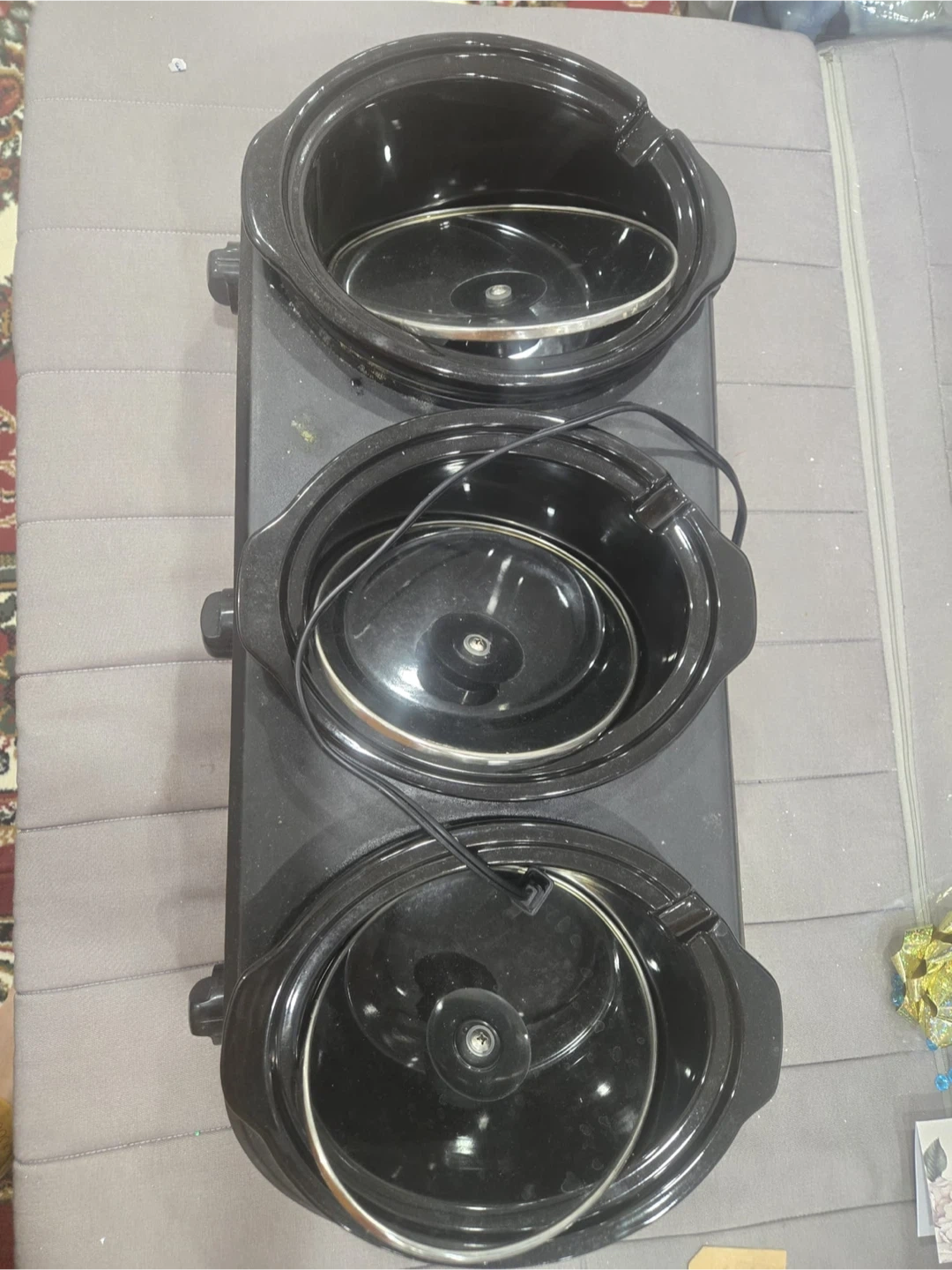 18Selling a triple slow cooker! It's great for parties or cooking multiple dishes at once. Each pot has its own temperature control, so you can keep things warm or cook on high. One of them has slightly burnt surface but it’s in working condition