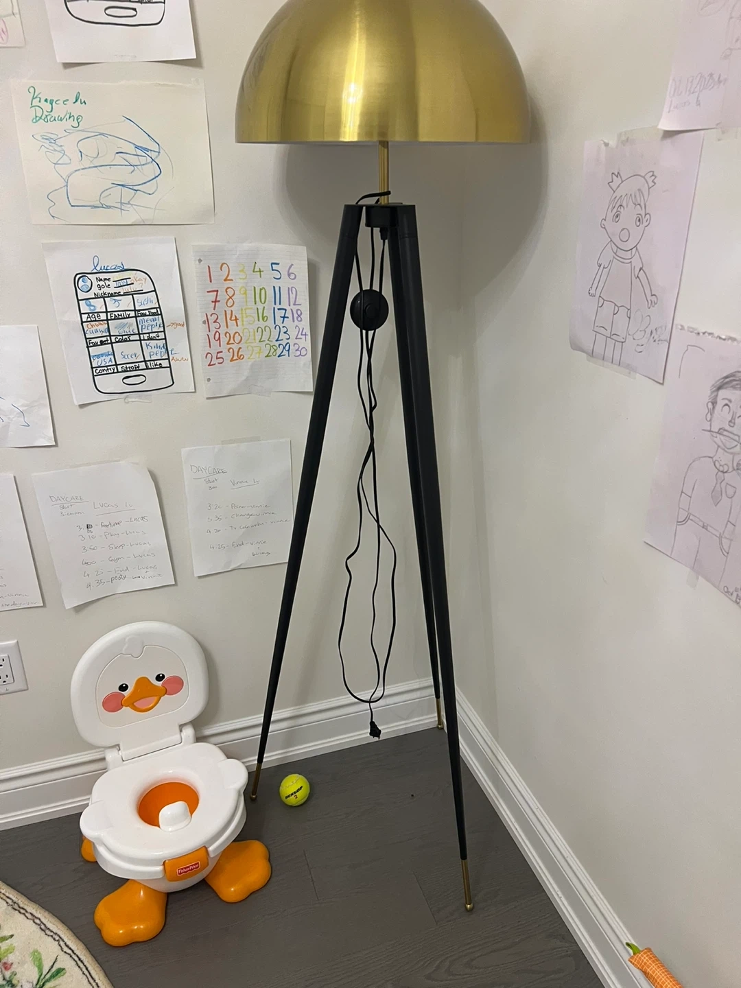 Selling a stylish tripod floor lamp! It features a sleek black tripod base complemented by a beautiful gold dome shade. It would be a great addition to any room!