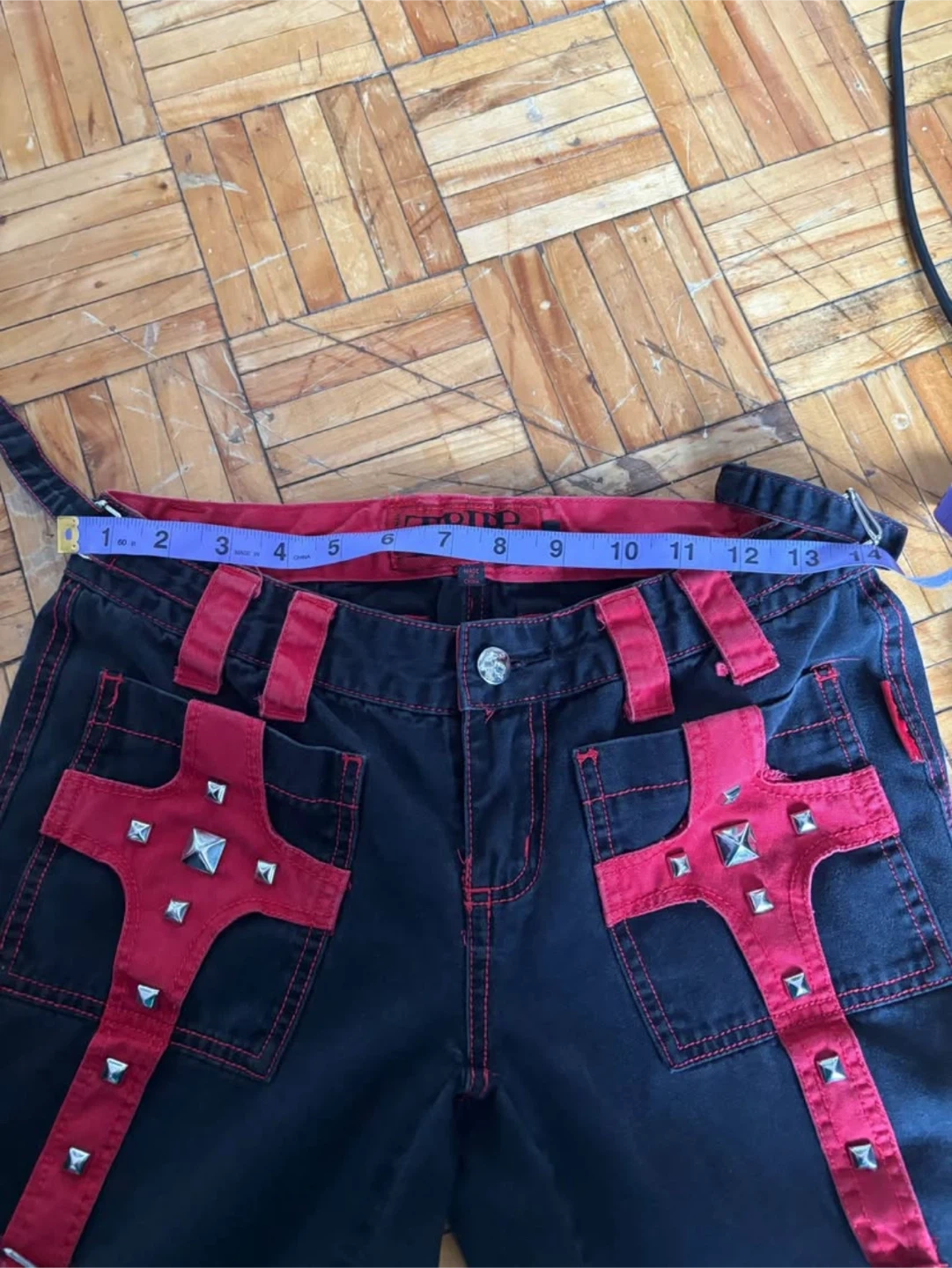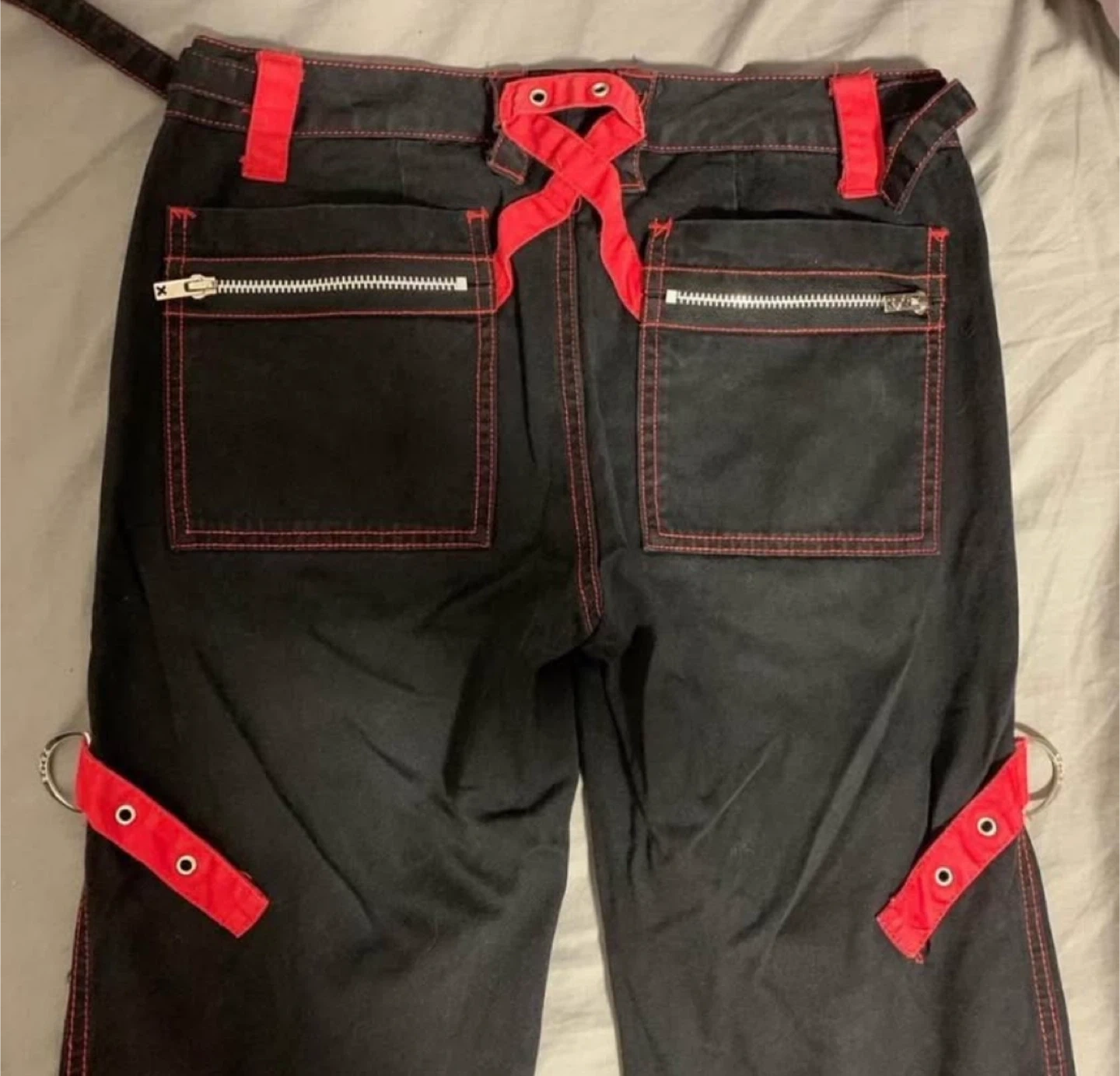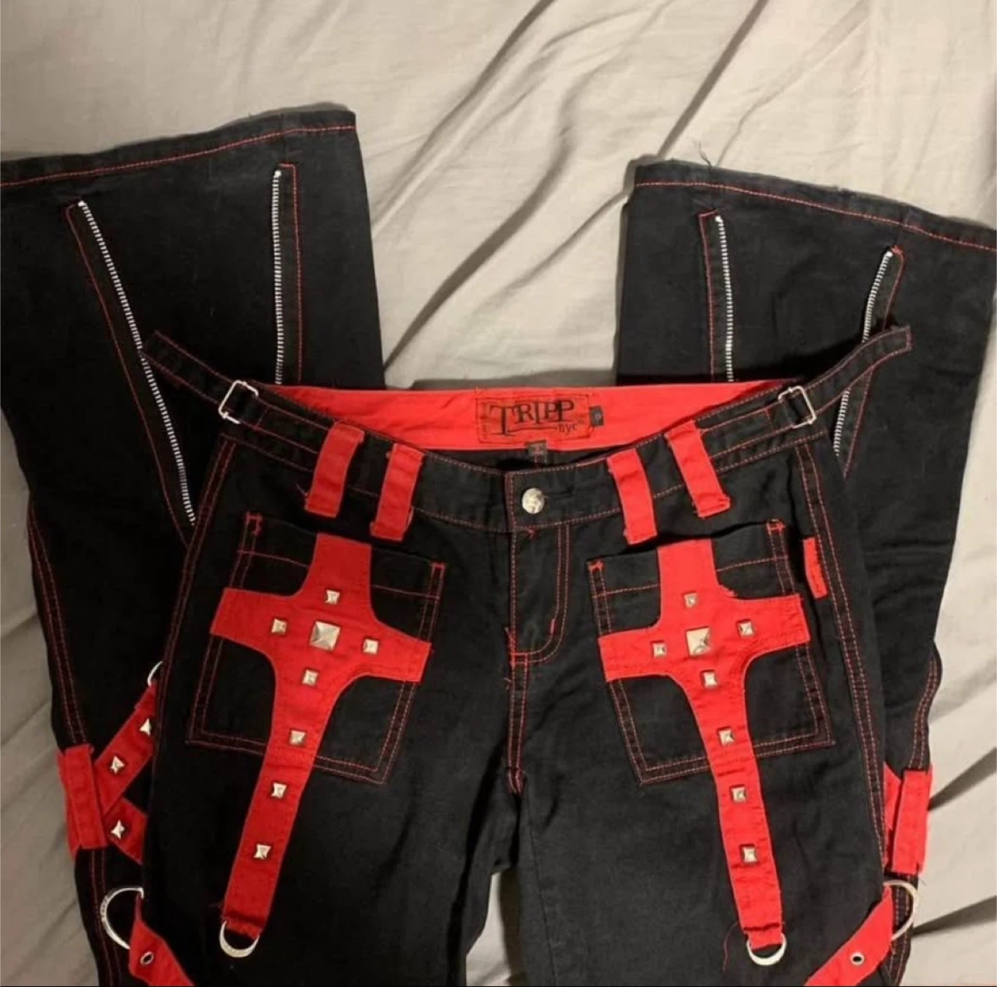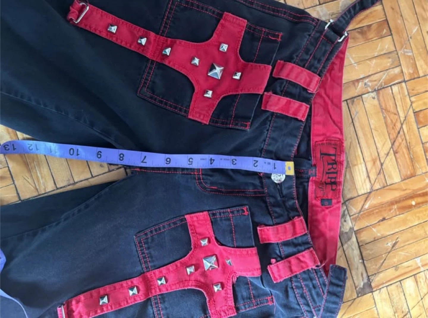 15Selling a pair of rare deadstock TRIPP NYC pants in black with red accents! They feature studded details and a unique design. Size 0 womens but can fit up to 2, waist adjusters as well.