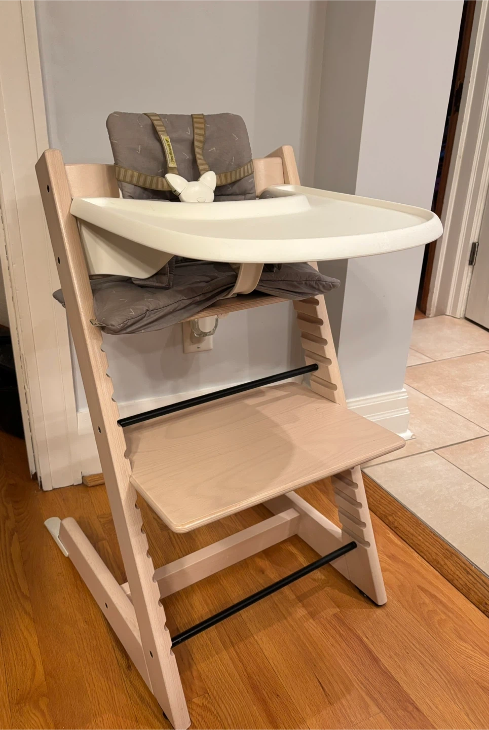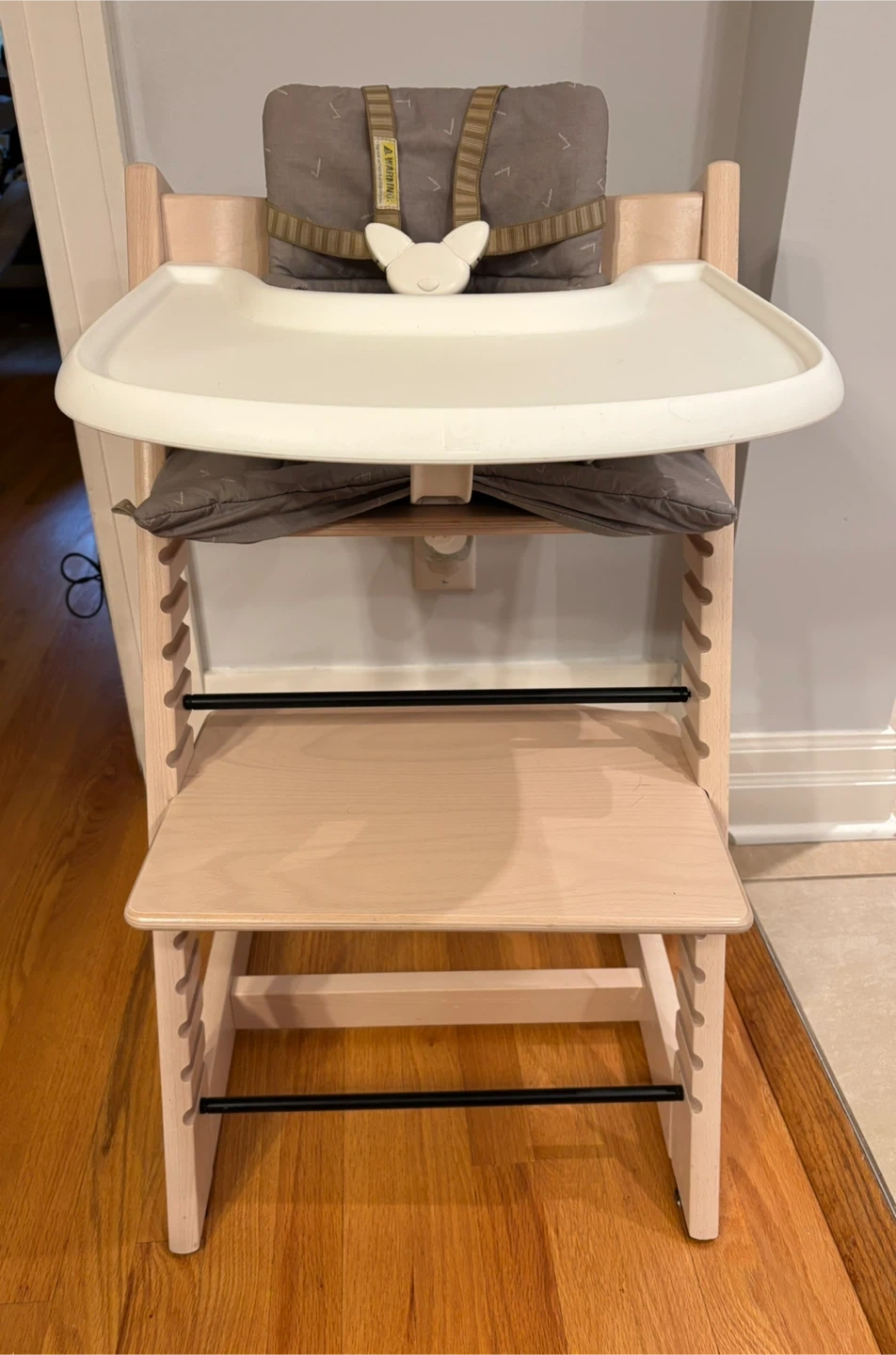 Tripp Trapp High Chair for sale. Purchased brand new in 2021 for approx $600. Includes 5 point harness, seat cushion and white tray Website description: The Chair That Grows With The Child – A Chair For Life. From Birth: The natural place for your newborn, the Newborn Set is designed to give your baby the interaction they love from birth. Cozy, comfortable and ergonomic, it lifts your newborn up to your height at the table. This enables eye contact and a great opportunity to spend quality time together with the whole family. From 6 Months: At around six to nine months, your little one will be able to begin sitting upright unaided. The Tripp Trapp® Baby Set gently supports your baby to comfortably sit at the table. When your child can confidently climb in and out of their chair on their own, you can remove the Baby Set. From 6 Months+: A chair for life What's special about a chair that grows with you? It stays with you. Made from high-quality European beech wood, the iconic Tripp Trapp chair is strong, stylish and durable. Fully adjustable, it provides a comfortable seat that can be used from the early years well into adulthood. Did you know that it holds up to 242 lbs? Features Convenient all in one high chair plus accessories package that provides everything your child needs from 6 months to 3 years Your child can comfortably sit at the dining table and enjoy mealtimes with the rest of the family. A classic, iconic design that will never go out of style Unique adjustability of seat and footplate to ensure both back and feet support for any age Stable footrest that supports your child and provides comfort Solid construction and European beech wood can hold up to a 242 lb adult 5- point harness provided with baby set A 5-point harness is included with a chair for extra safety. Made with water-based, non-toxic paint and no harmful substances (free from bisphenol and phthalates)