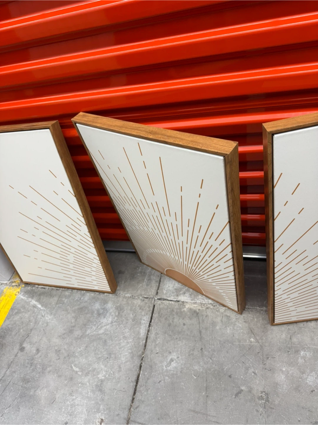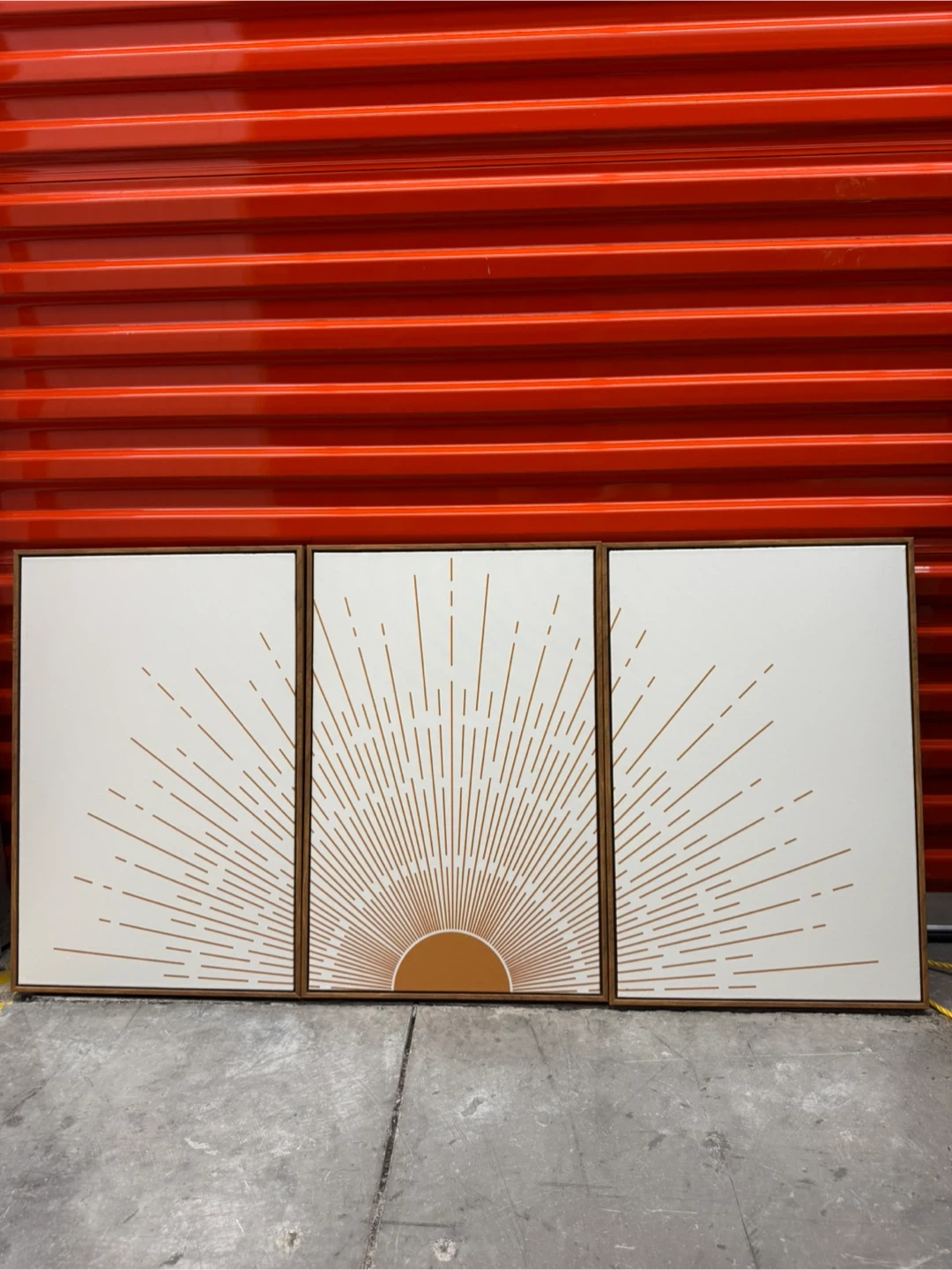 Selling a beautiful triptych wall art piece featuring a sunrise design. It's in great condition and would add a lovely touch to any room. The artwork is framed and ready to hang!