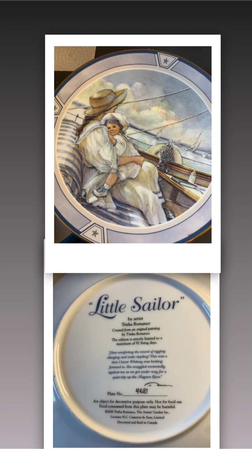 15Selling a Trisha Romance collector's plate titled "Little Sailor"! This plate is decorated and fired in Canada, featuring an original painting by Trisha Romance. The edition is strictly limited to a maximum of 92 firing days. Plate number is 4681. A lovely art object for decorative purposes!