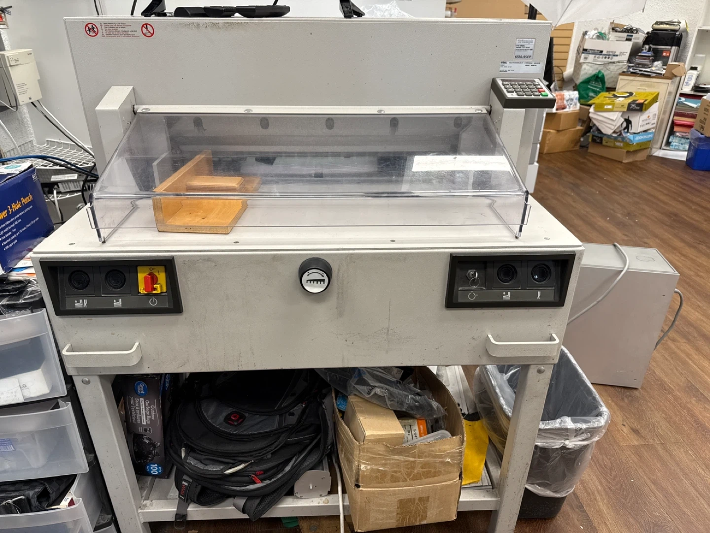 Selling a Triumph Ideal 6550-95 EP paper cutter. It's in good working condition and ready for a new home in your business or workspace! This heavy-duty cutter is perfect for precise and efficient paper cutting tasks