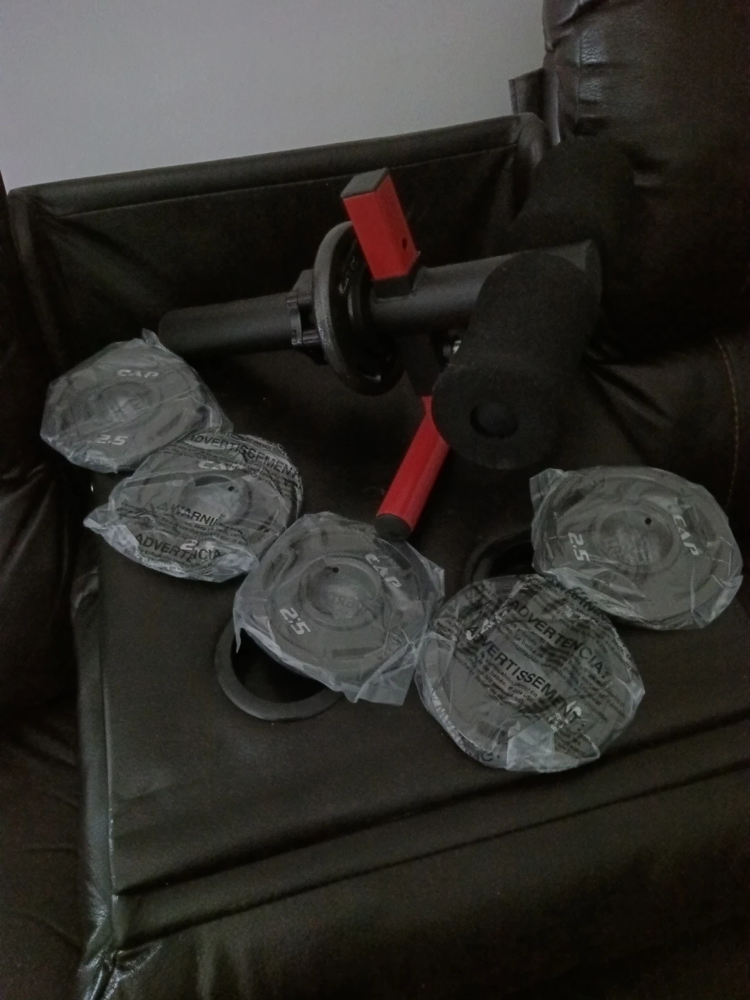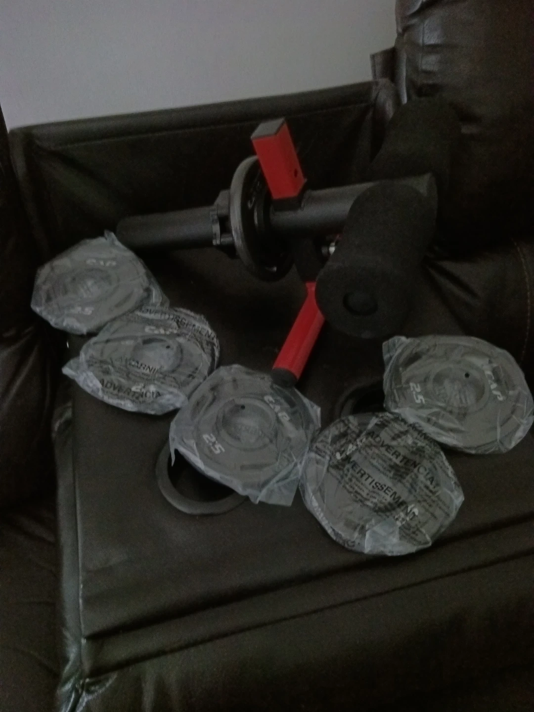 This TIB Barbell home gym system comes with five 2.5lb weight plates, totalling 12.5lbs. It's designed for a compact home workout. The unit has padded grips for comfort.