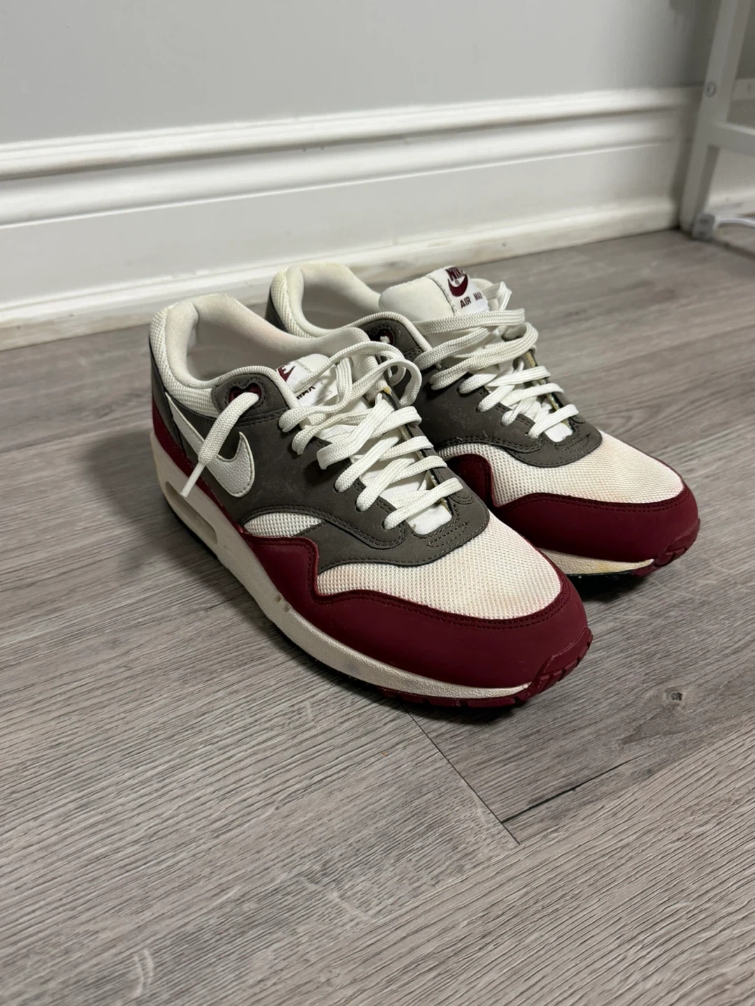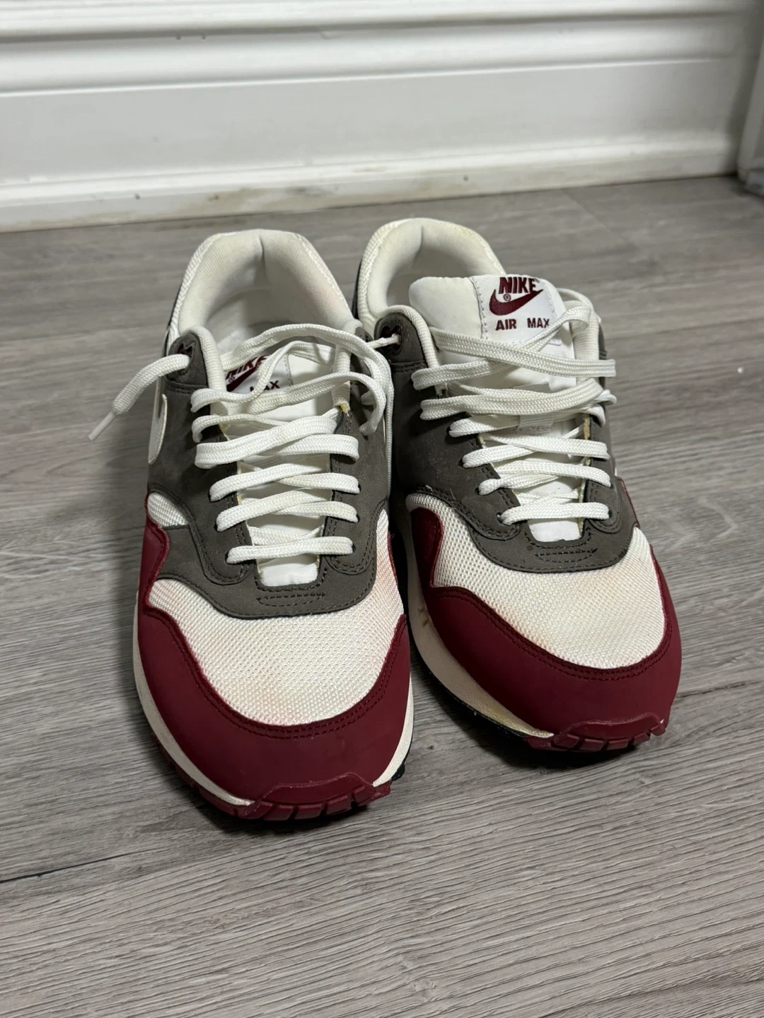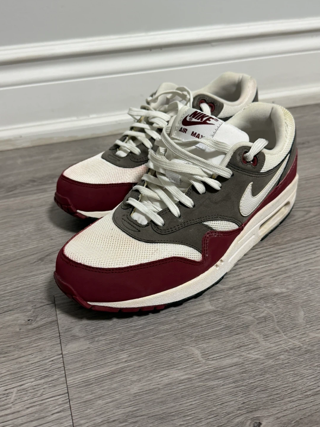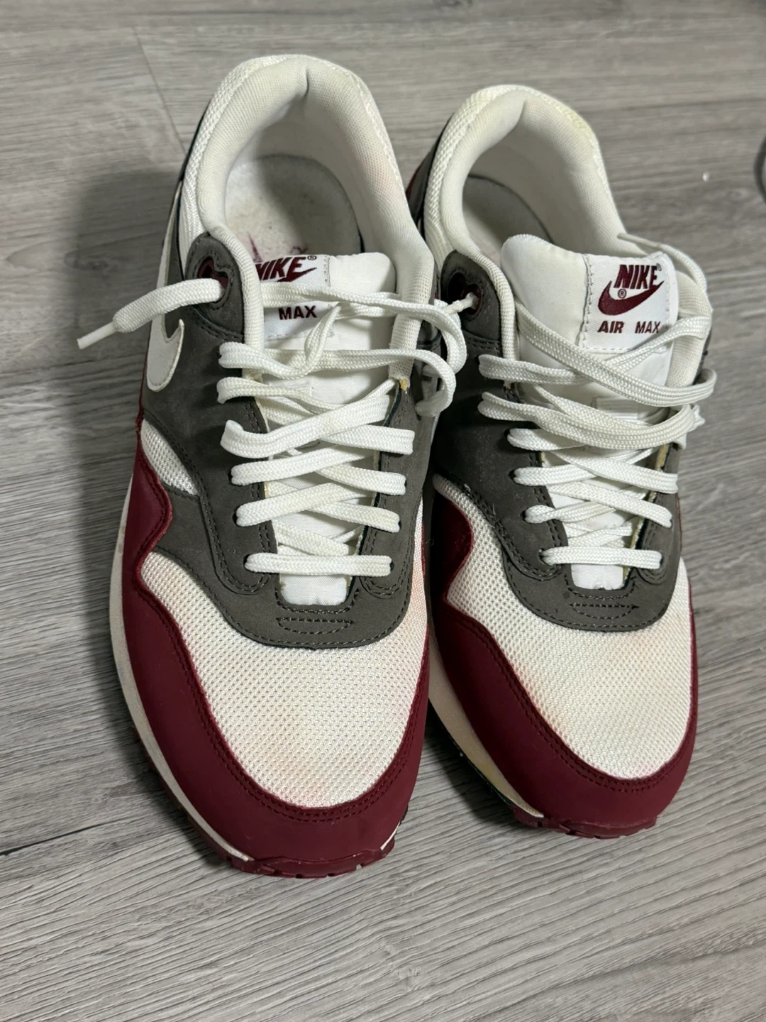 Classic Nike Air Max 1 sneakers in a white, grey, and burgundy colourway. These kicks offer iconic style and comfort. Textile and suede upper.