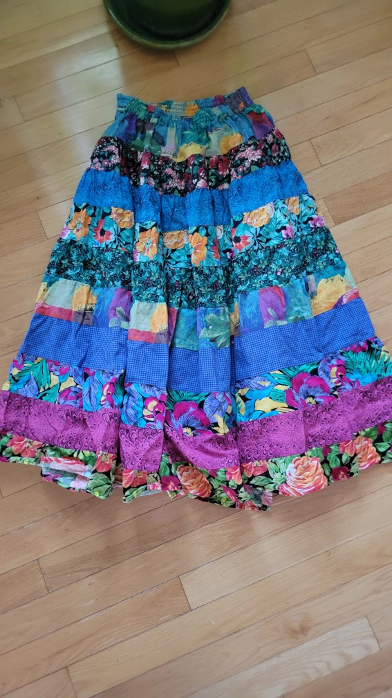 This is a fun and colourful maxi skirt! It features a patchwork design with various floral patterns and colours. The skirt has an elastic waistband for a comfortable fit. Perfect for adding a pop of colour to your wardrobe!