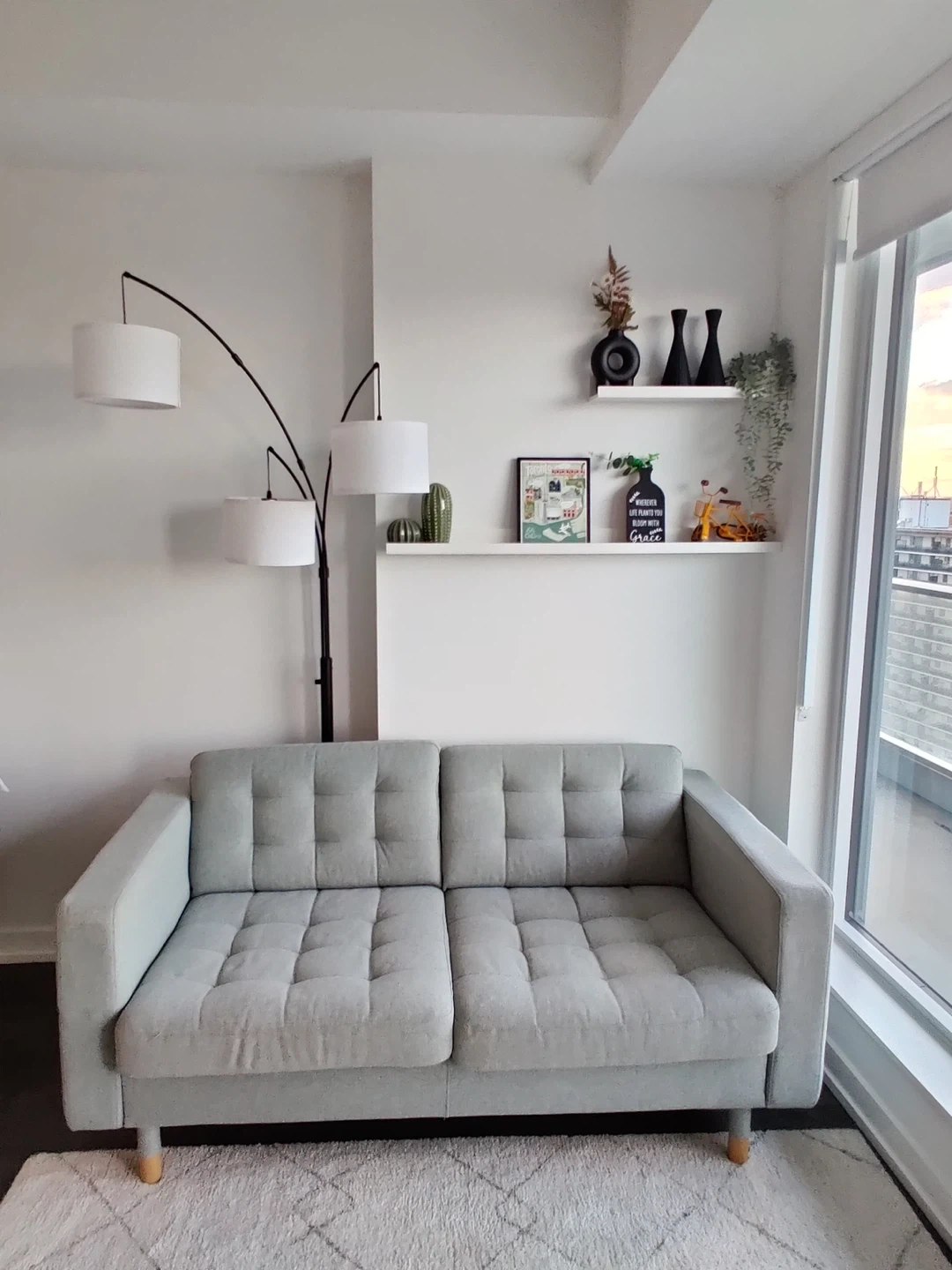 Pastel green fabric sofa with tufted cushions. It has wooden legs and a simple modern design. Seats two people comfortably.