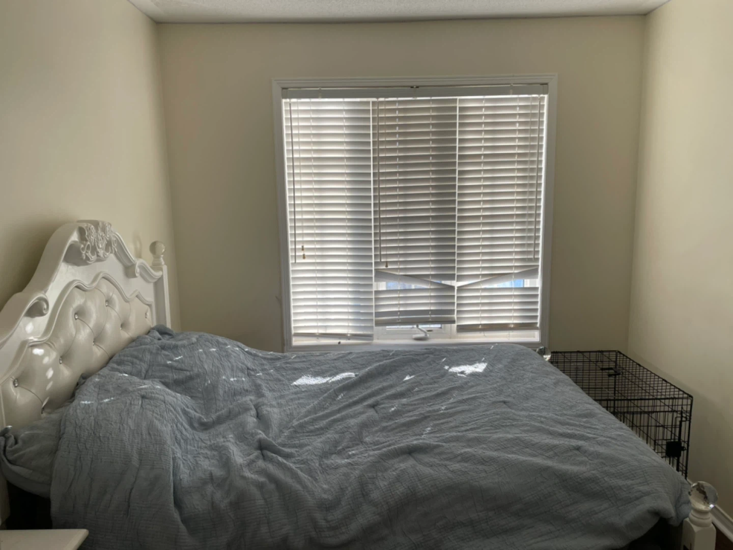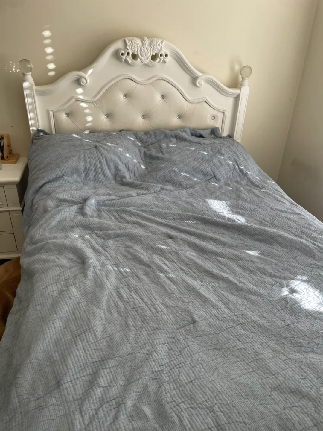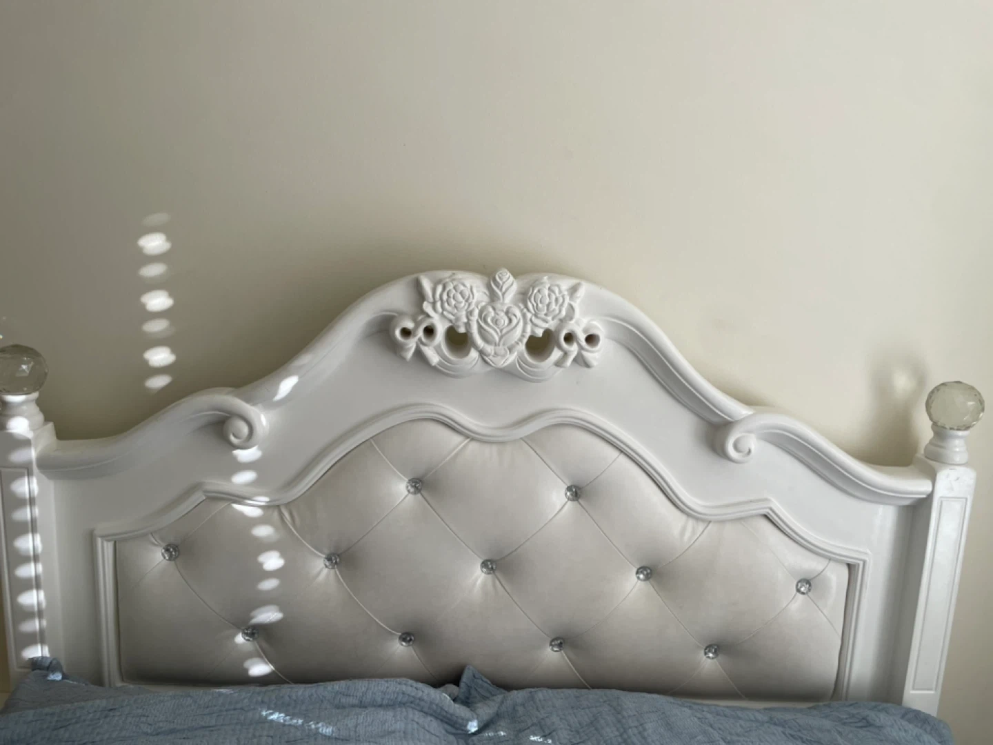 Elegant white bed frame with a tufted headboard and crystal-like accents. It features ornate detailing and a padded centre section. This bed is a nice addition to a bedroom!