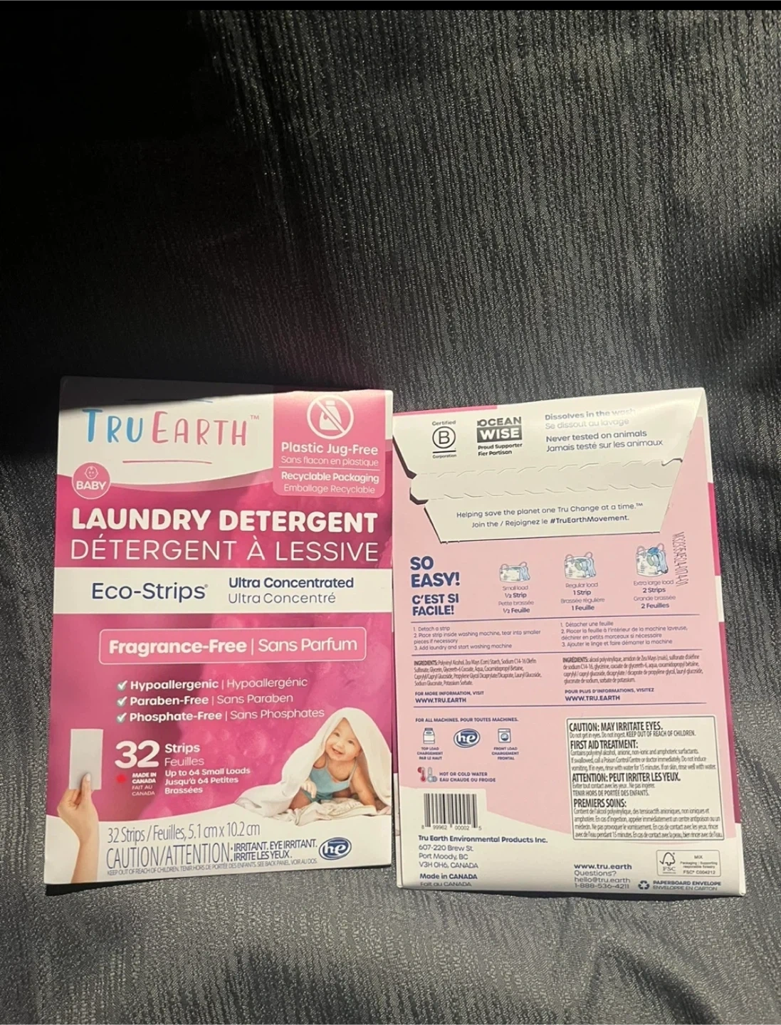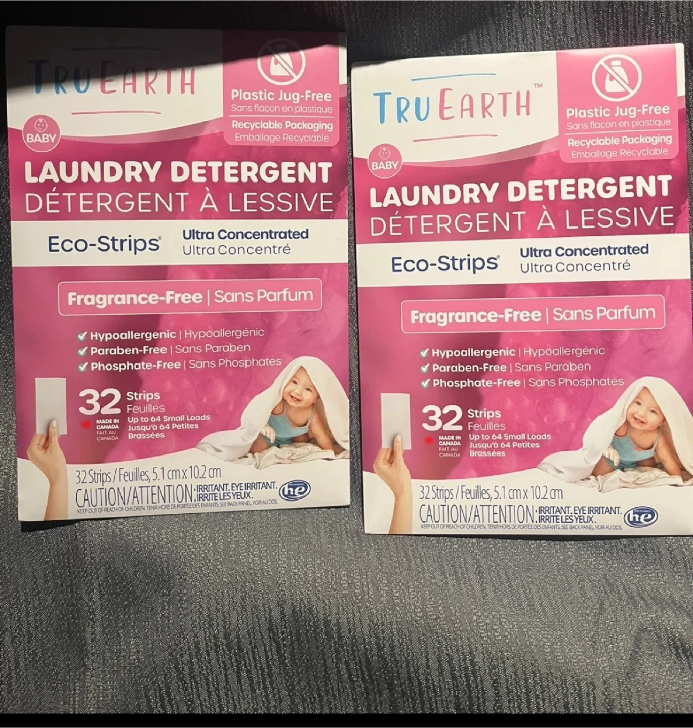 Selling Tru Earth Baby Laundry Detergent Eco-Strips. These are fragrance-free and ultra-concentrated. They're hypoallergenic, paraben-free, and phosphate-free. Each package contains 32 strips and is made in Canada