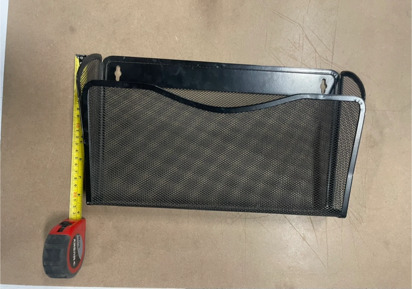 This is a black mesh wall file holder. It's made of metal mesh. Dimensions are approximately 13 inches wide and 9 inches tall.