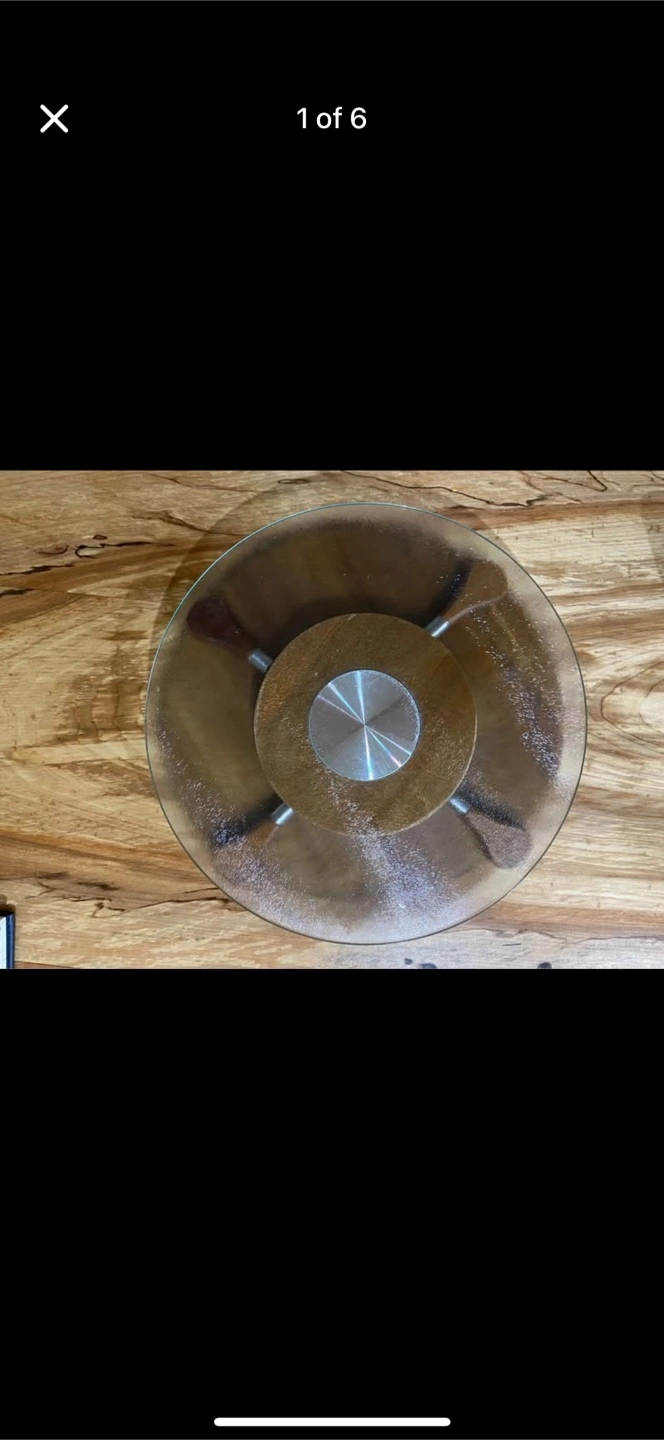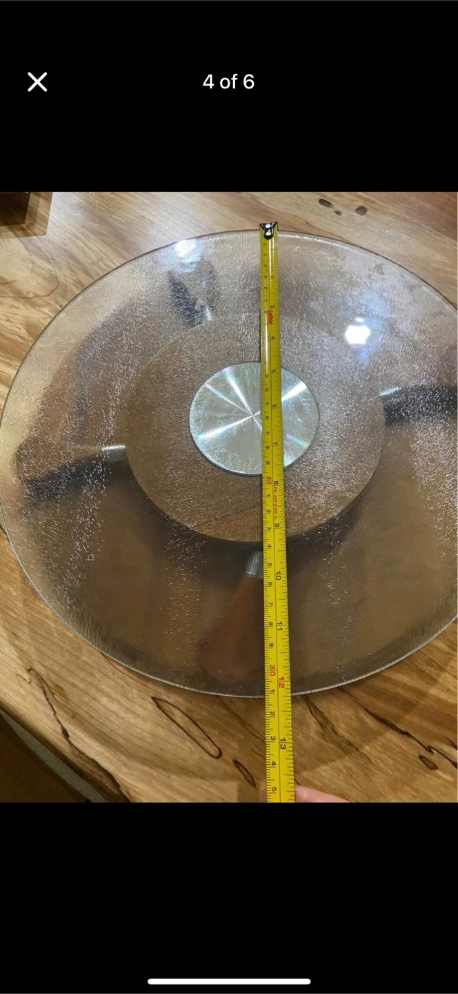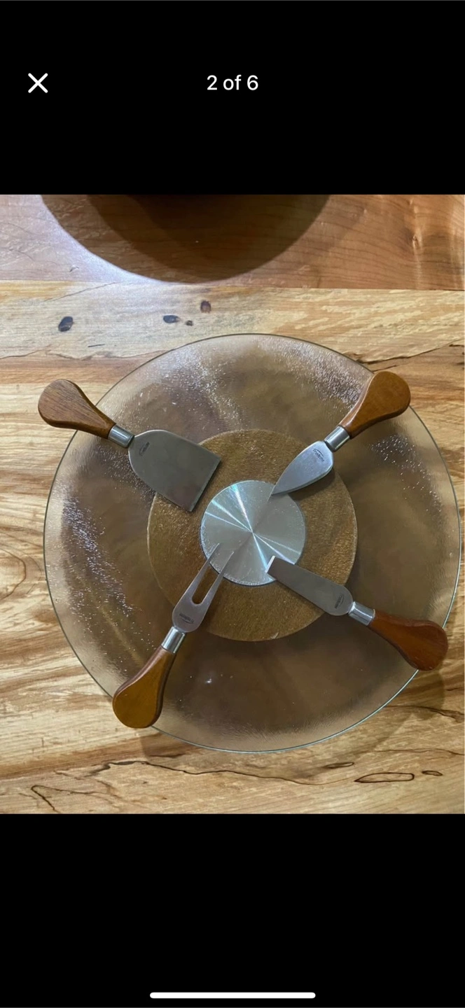 Selling a Trudeau glass cheese board with a set of cheese knives. The diameter of the board is approximately 13 inches. Great for entertaining!