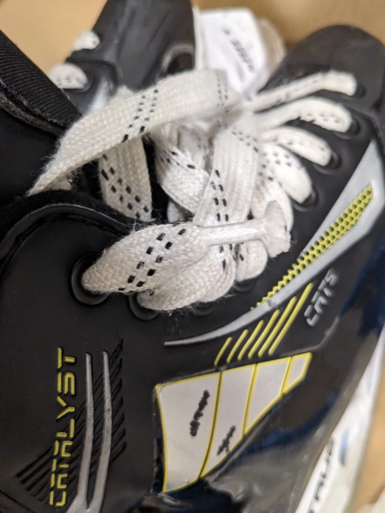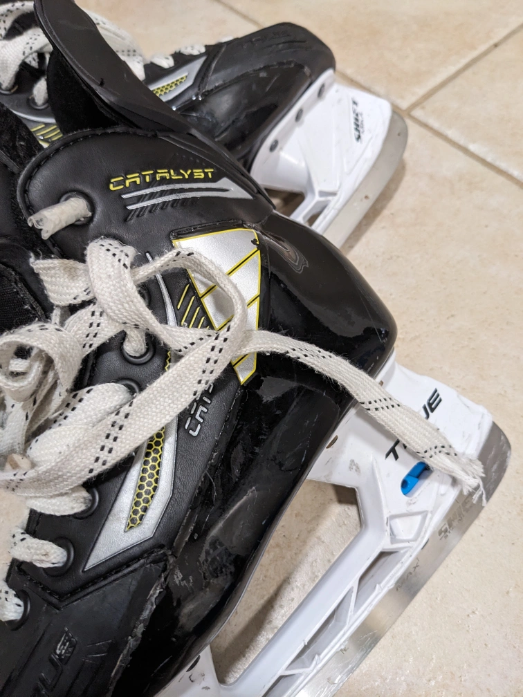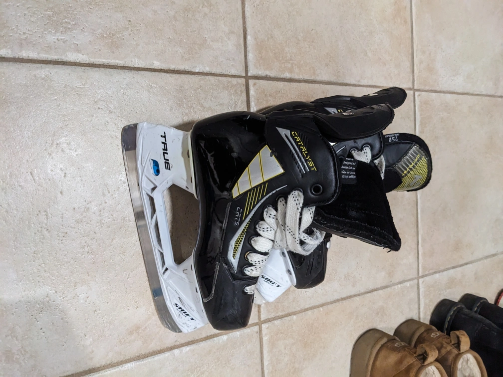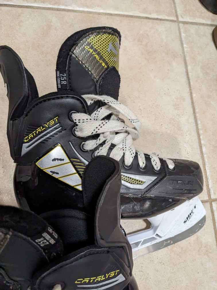Great skates for kids. Cosmetic wear shown in photos. Skate size 2.5, fits shoe size 3.5 US. Worn for only one hockey season. Feel free to contact me anytime!