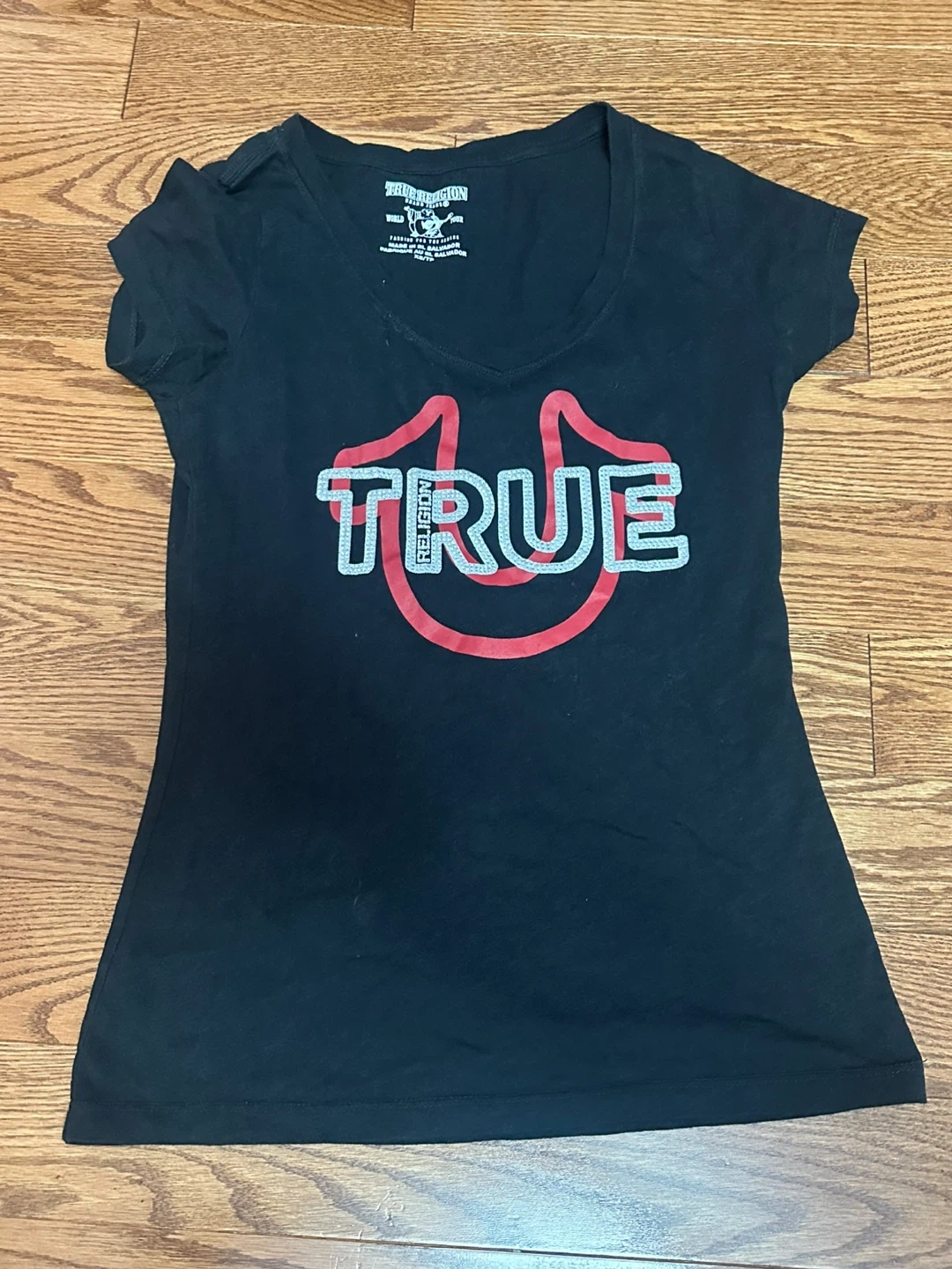 Selling a True Religion black t-shirt with a red and silver glittery logo. It's in great condition and perfect for casual wear!