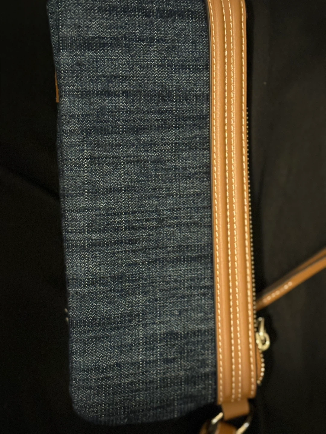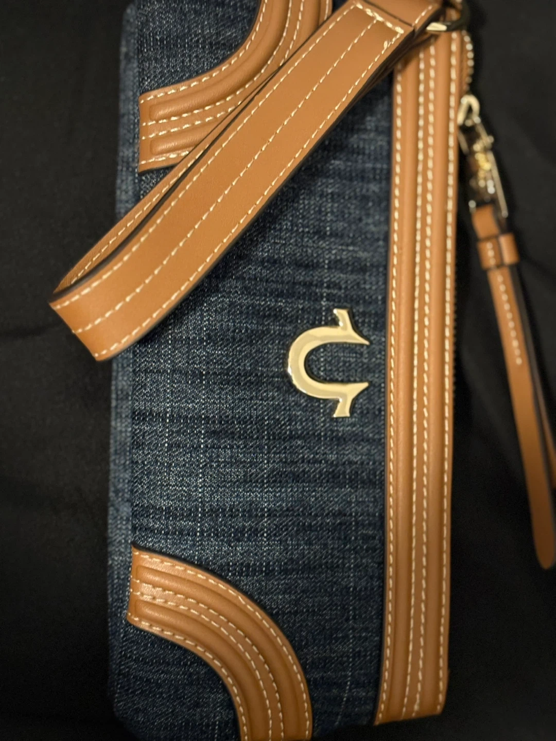 I'm selling a True Religion denim wristlet. It's in great condition and perfect for carrying your essentials when you don't want to carry a big purse. It features a denim exterior with brown leather trim and the True Religion logo. It's a stylish and practical accessory! (PICKUP)