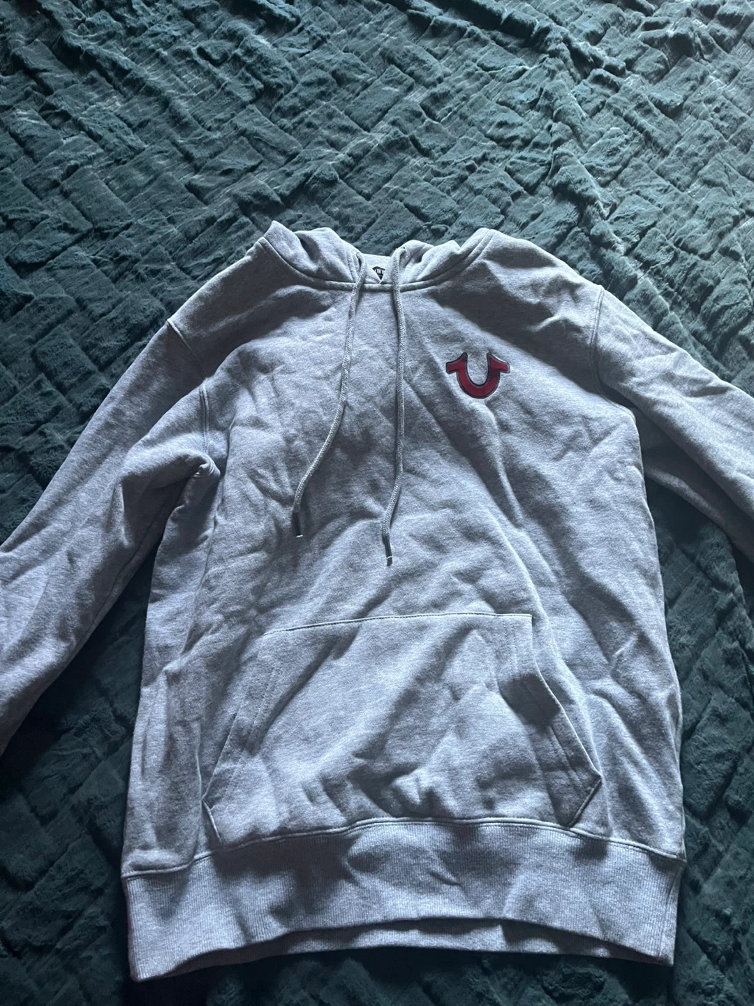 10Selling a True Religion hoodie in grey. It features the iconic logo on the front and a cool graphic on the back. It's super comfy and perfect for everyday wear!