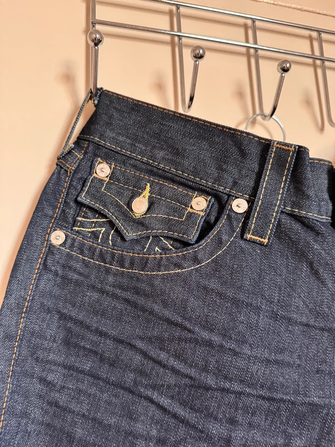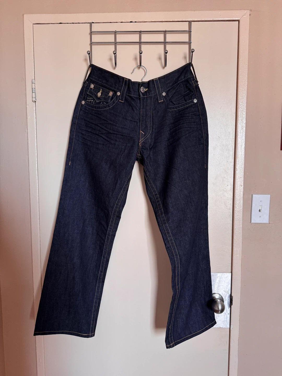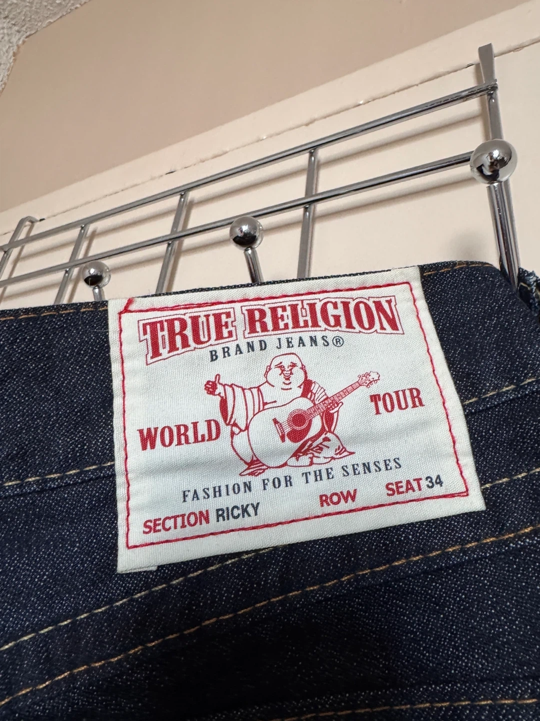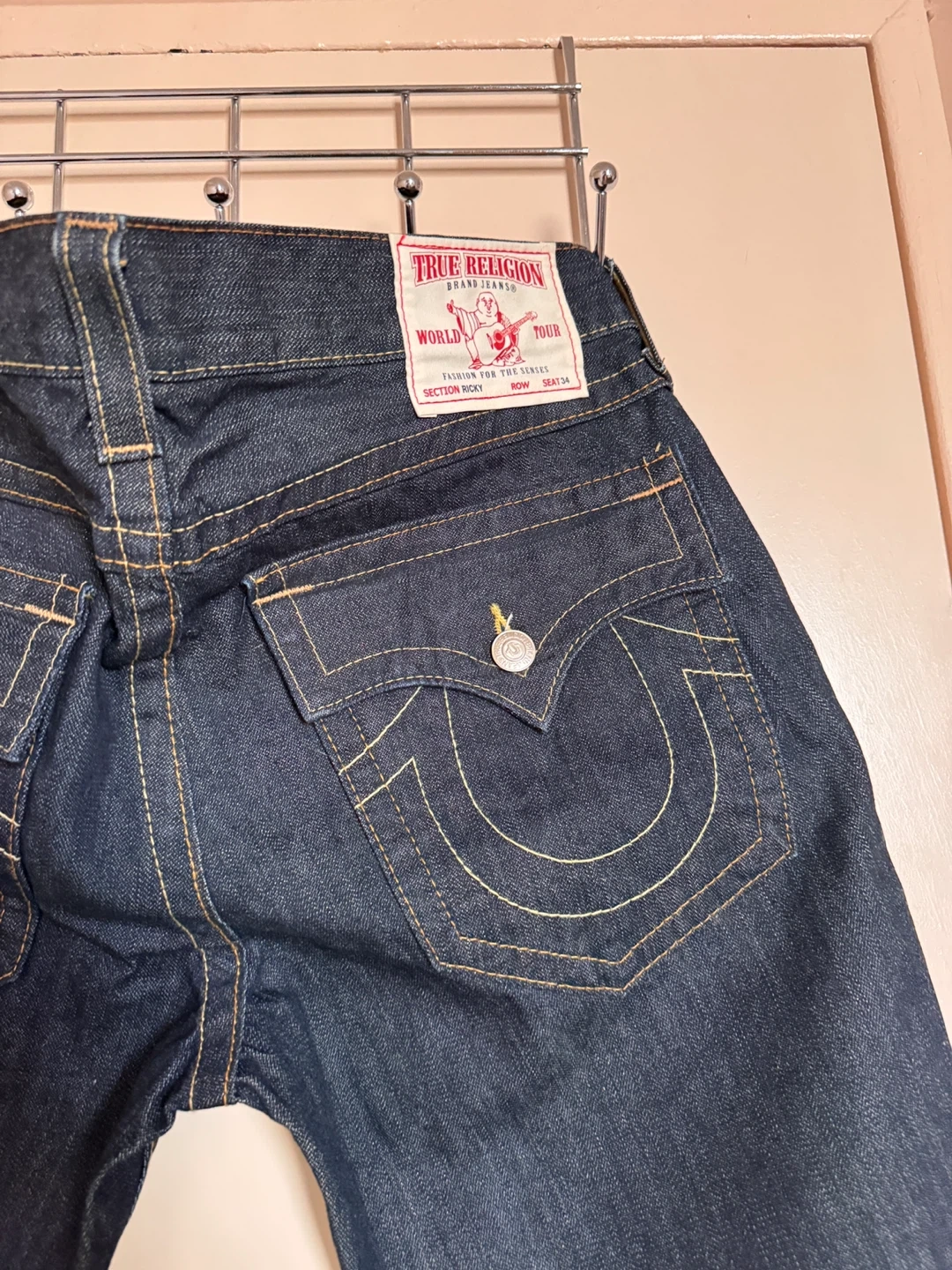 True Religion jeans in a dark wash, size 34. These are the Ricky style, featuring the classic True Religion details and pocket design.