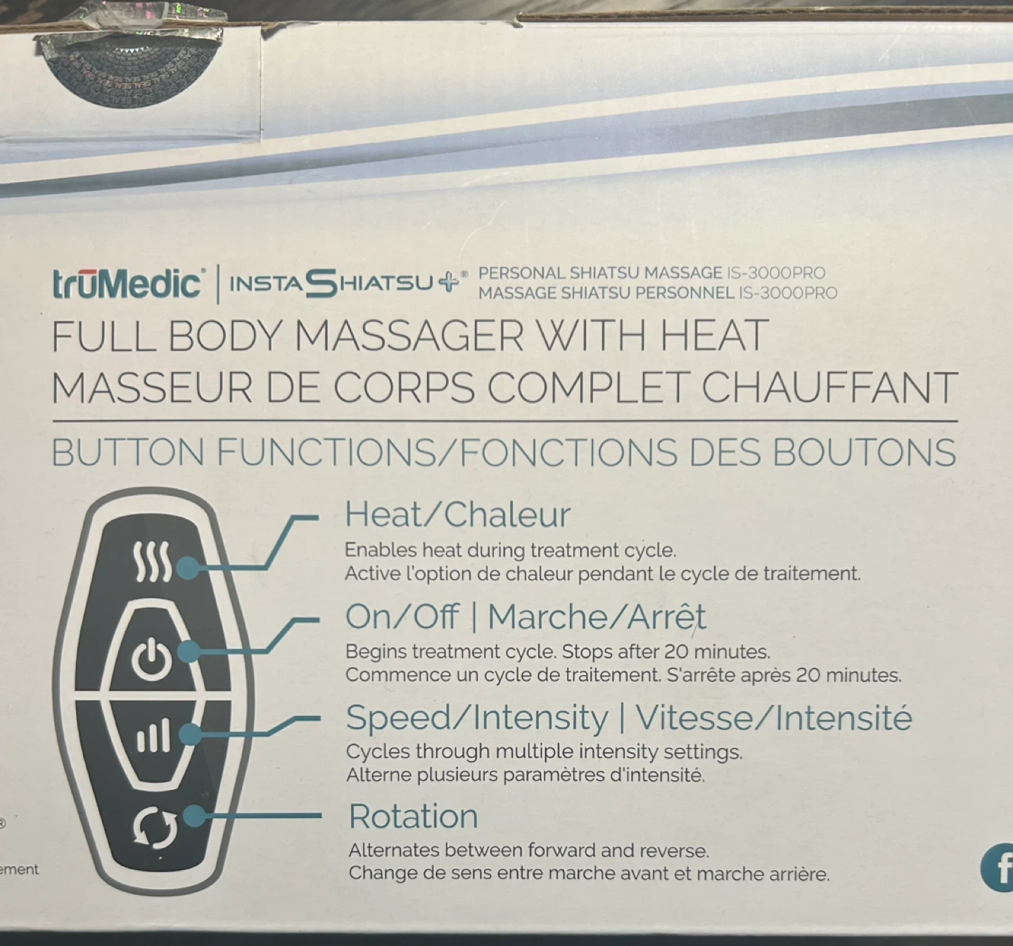 31Get ready to relax with this truMedic InstaShiatsu+ IS-3000PRO full body massager with heat! It features multiple intensity settings and alternates between forward and reverse rotation. It begins a treatment cycle and stops after 20 minutes. Included in the box are the InstaShiatsu unit and an A/C adapter with cable