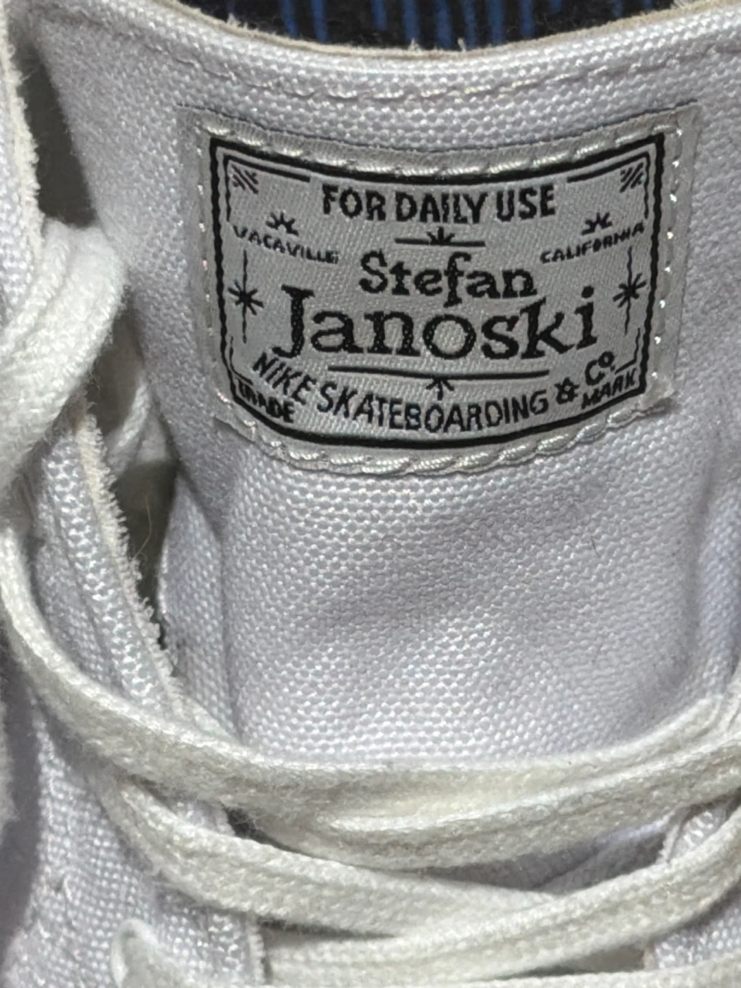 These are white Nike Stefan Janoski canvas sneakers. They're a US size 8, EUR 41, UK 7. Made in China. These shoes are great for daily skateboarding use!