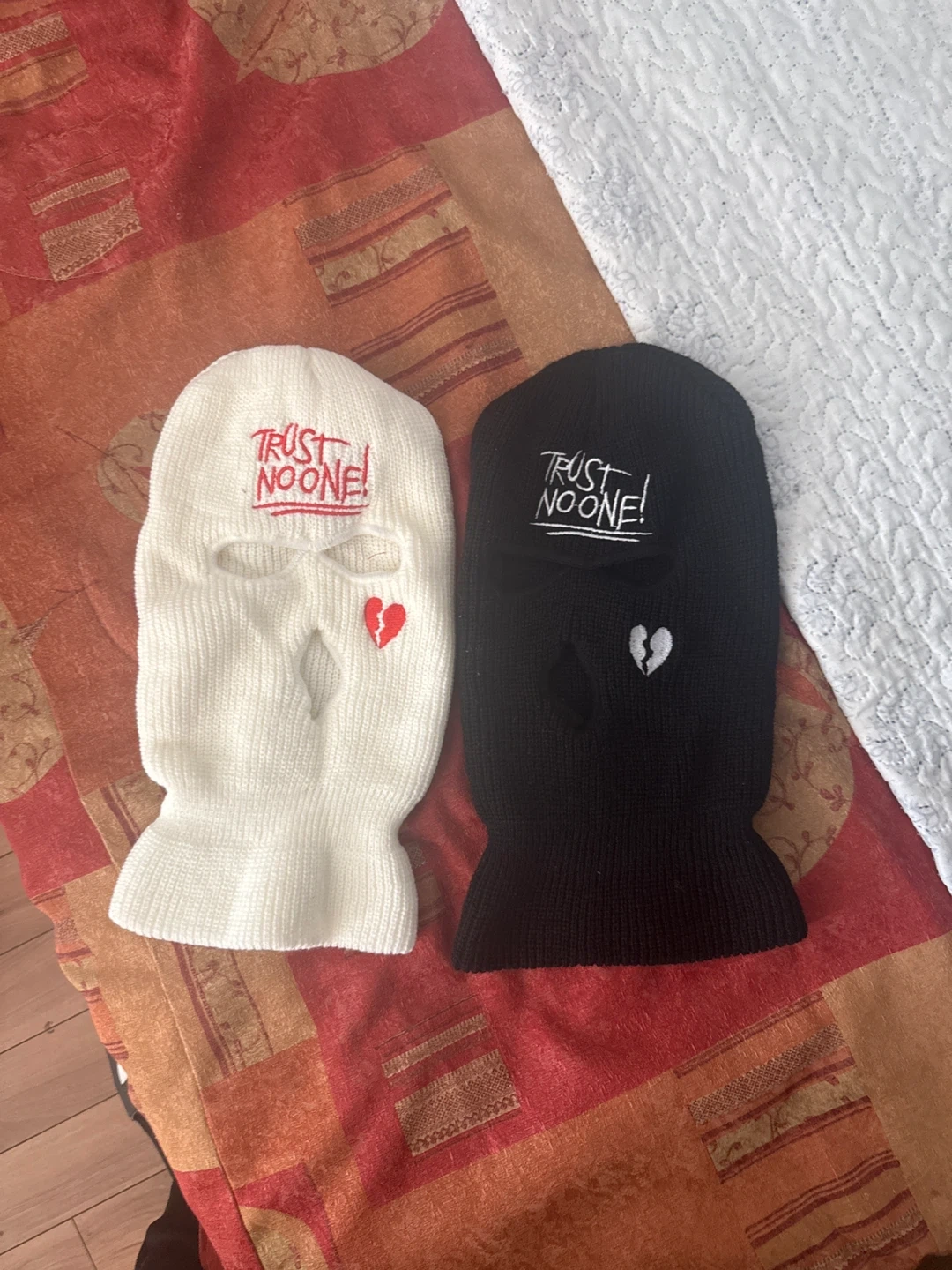 Selling a pair of ski masks. One is white and the other is black. Both have the words "Trust No One!" embroidered on them, along with a broken heart design. They are in good condition and ready for the slopes or just to keep you warm!