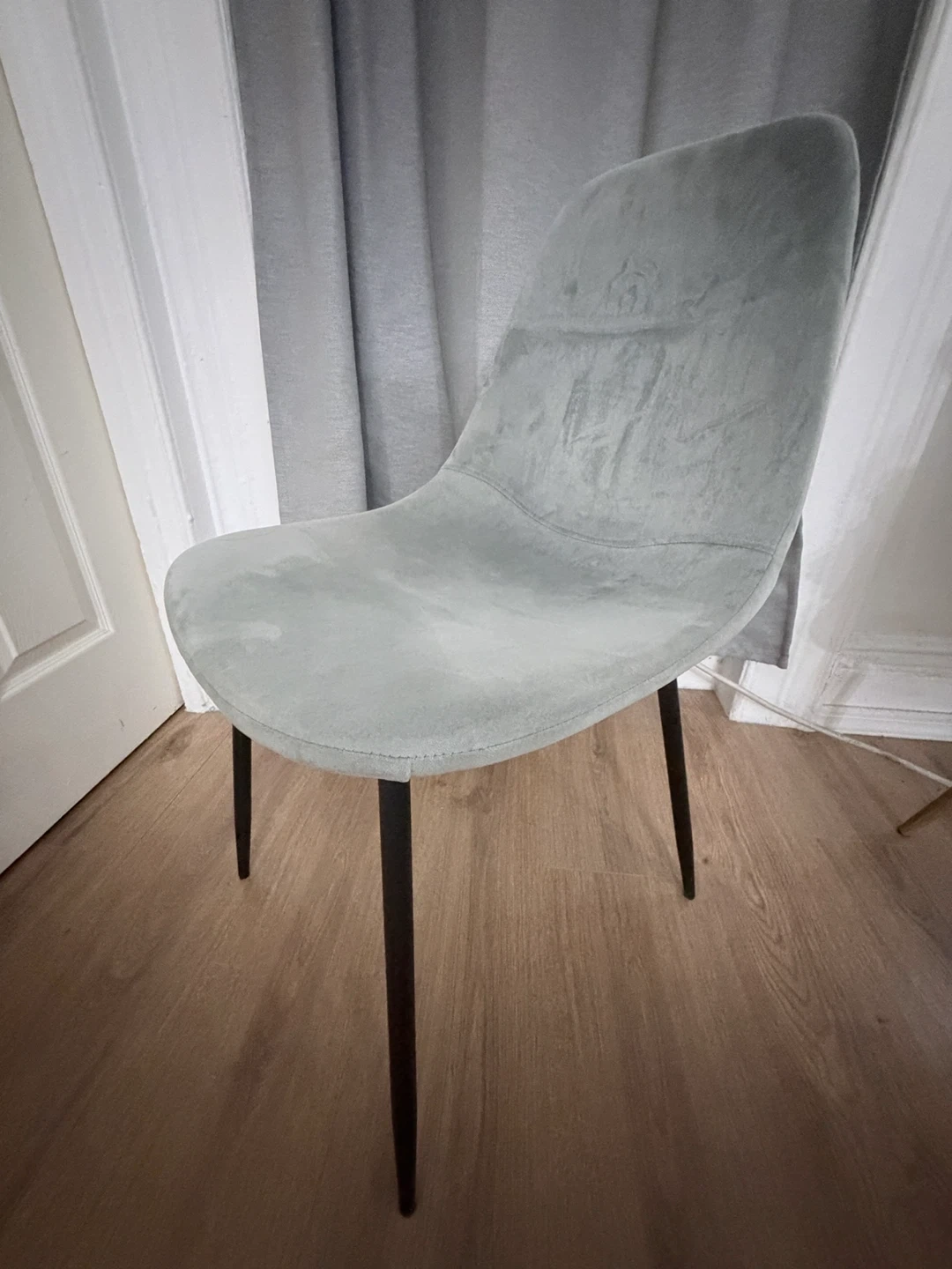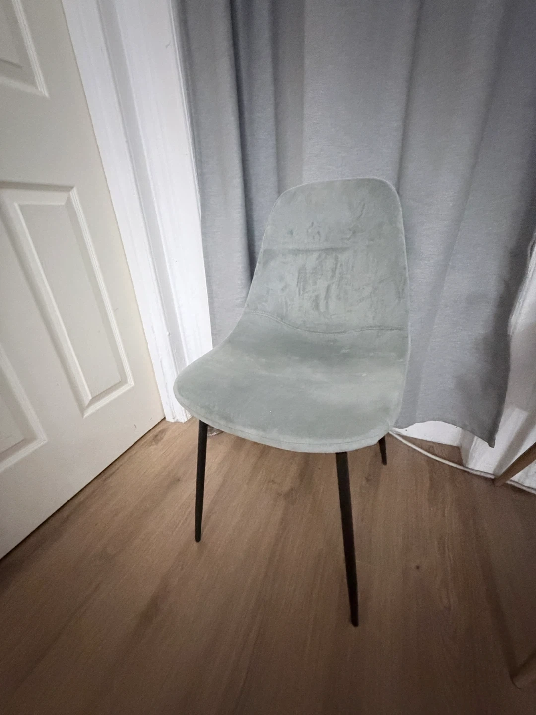 Selling a teal dining chair. It's in great condition and ready for a new home! The chair has black legs and a comfortable seat.