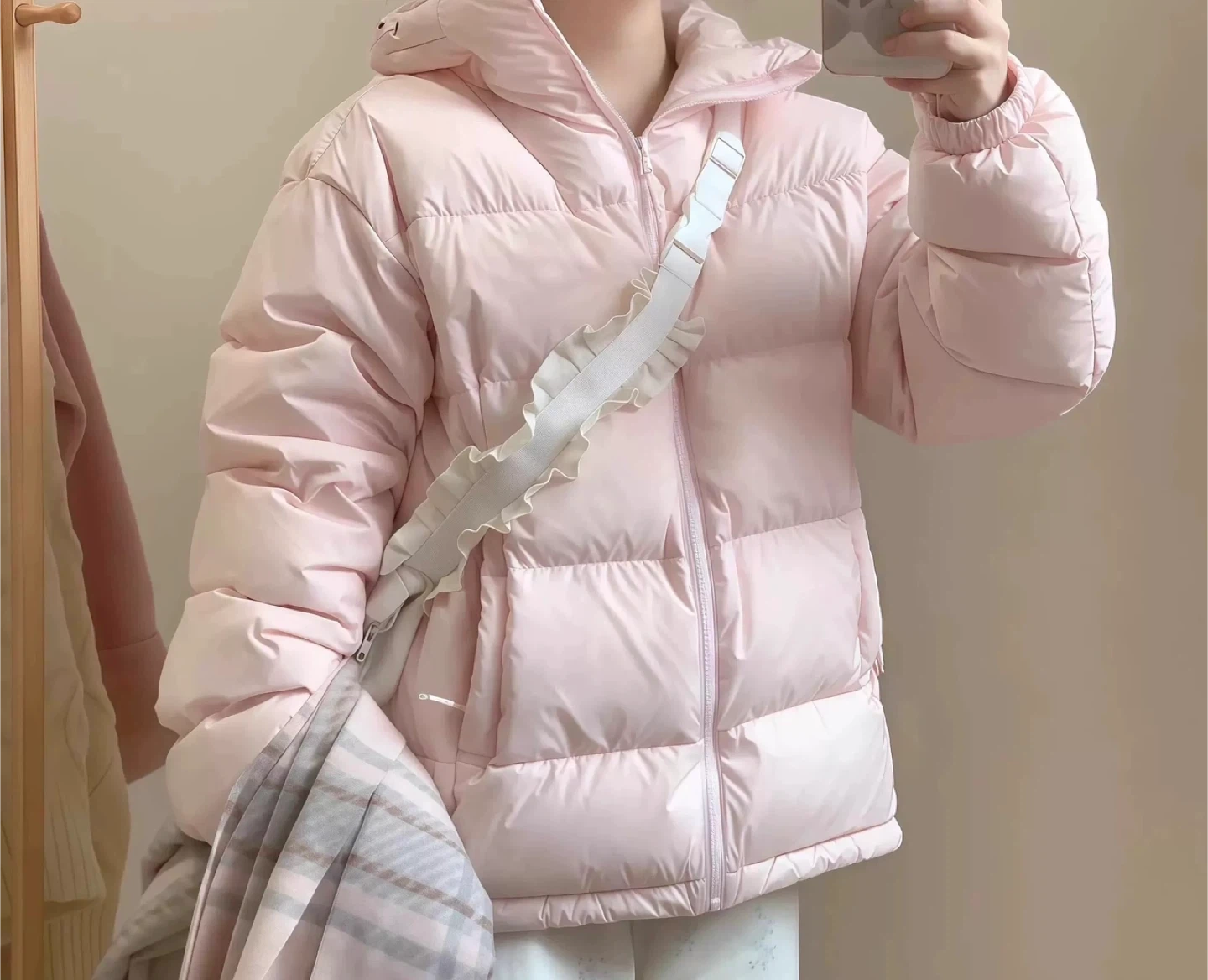 Selling a cute pink puffer jacket! It's in great condition and perfect for staying warm during the colder months. The jacket features a hood and a zippered front.