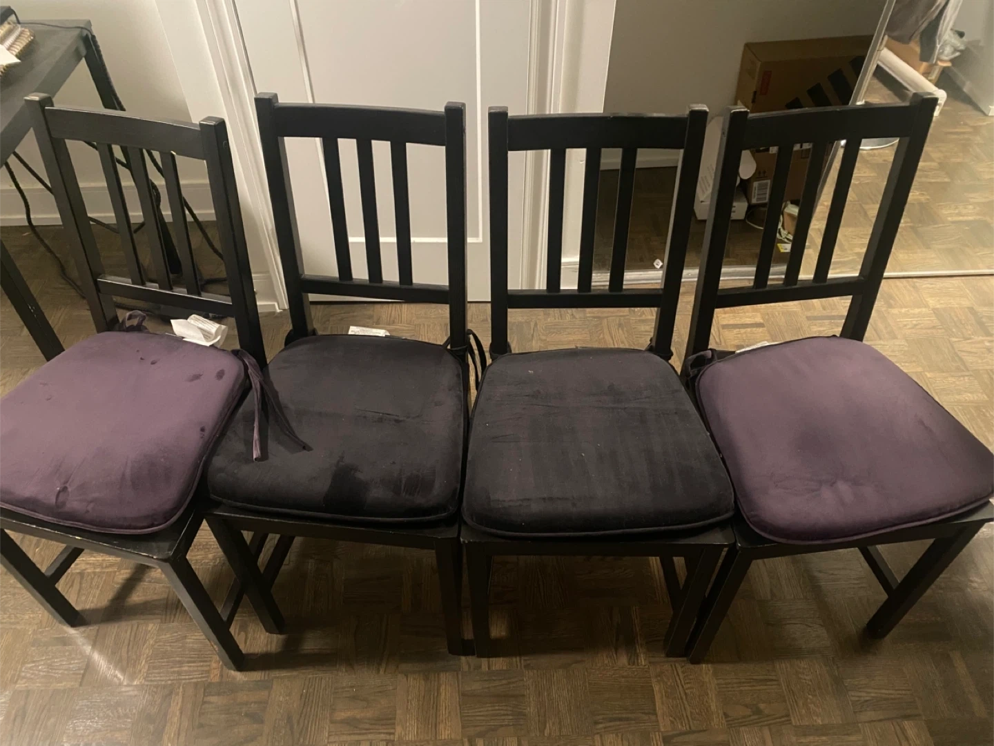 Chairs - I purchased the black cushions separately but they are included in the price. Two cushions are lighter than the others - those ones were used outside on my other chairs