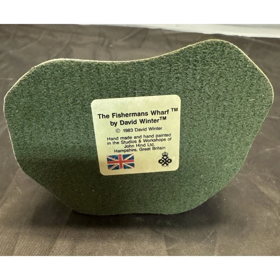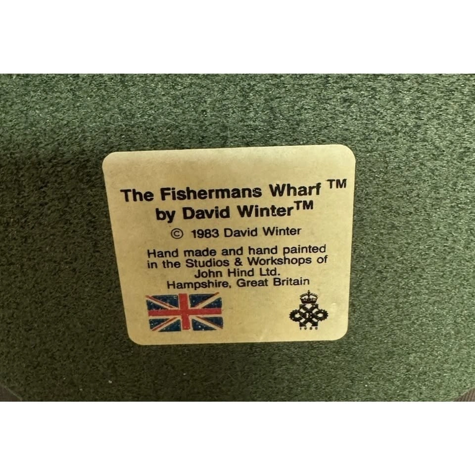 A beautifully crafted resin model depicting a Fisherman's Wharf scene from England. Hand painted with vibrant colors and intricate details, this miniature piece captures the essence of a seaside village with its charming design and authentic subject. Perfect for collectors or as a unique gift for any occasion, this delicate piece from 1983 by artist David Winter is sure to add a touch of nostalgia and English charm to any display or collection.