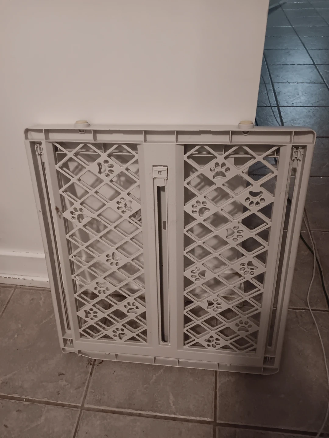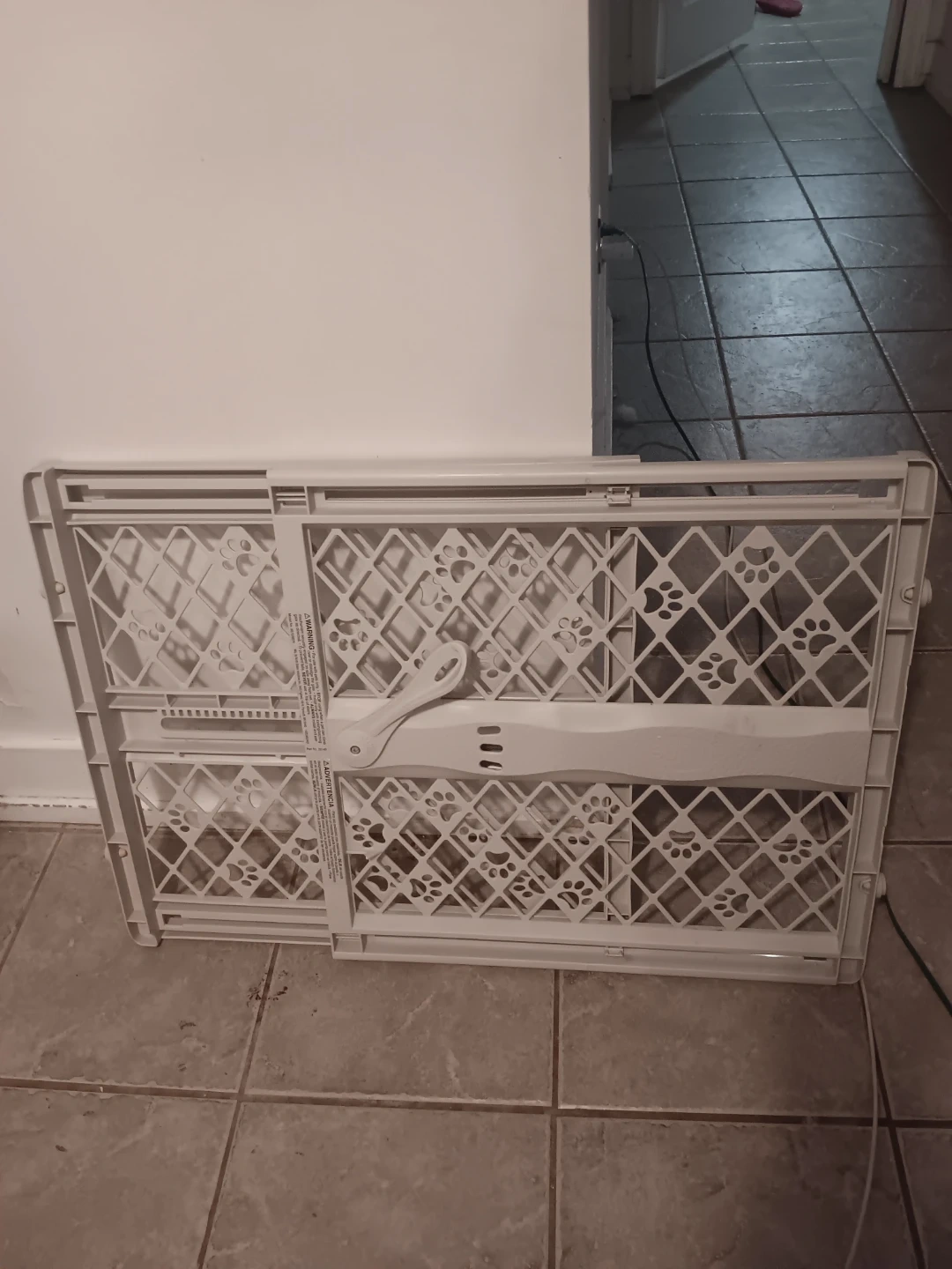 This is a versatile plastic pet gate, perfect for keeping your furry friends safely contained. It features a fun paw print design and an adjustable width to fit various doorways. Easy to set up and move around!