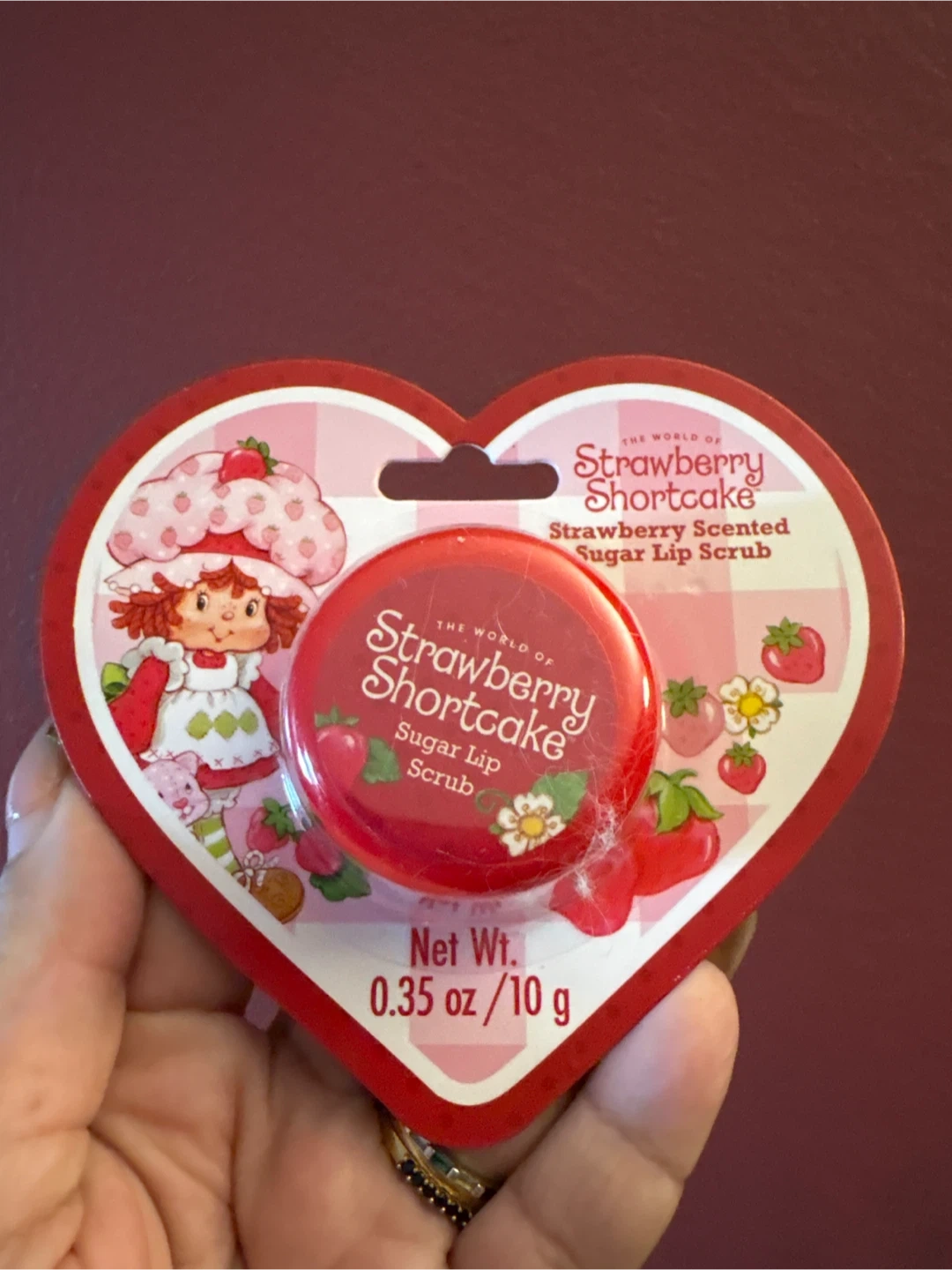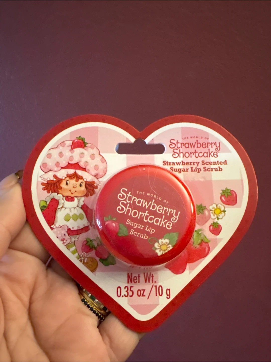 Strawberry Scented Sugar Lip Scrub from The World of Strawberry Shortcake. Contains coconut-infused sugar scrub. Make your lips smooth with this scrub. Massage a pinch onto lips, wipe off with a damp cloth or rinse with warm water. New