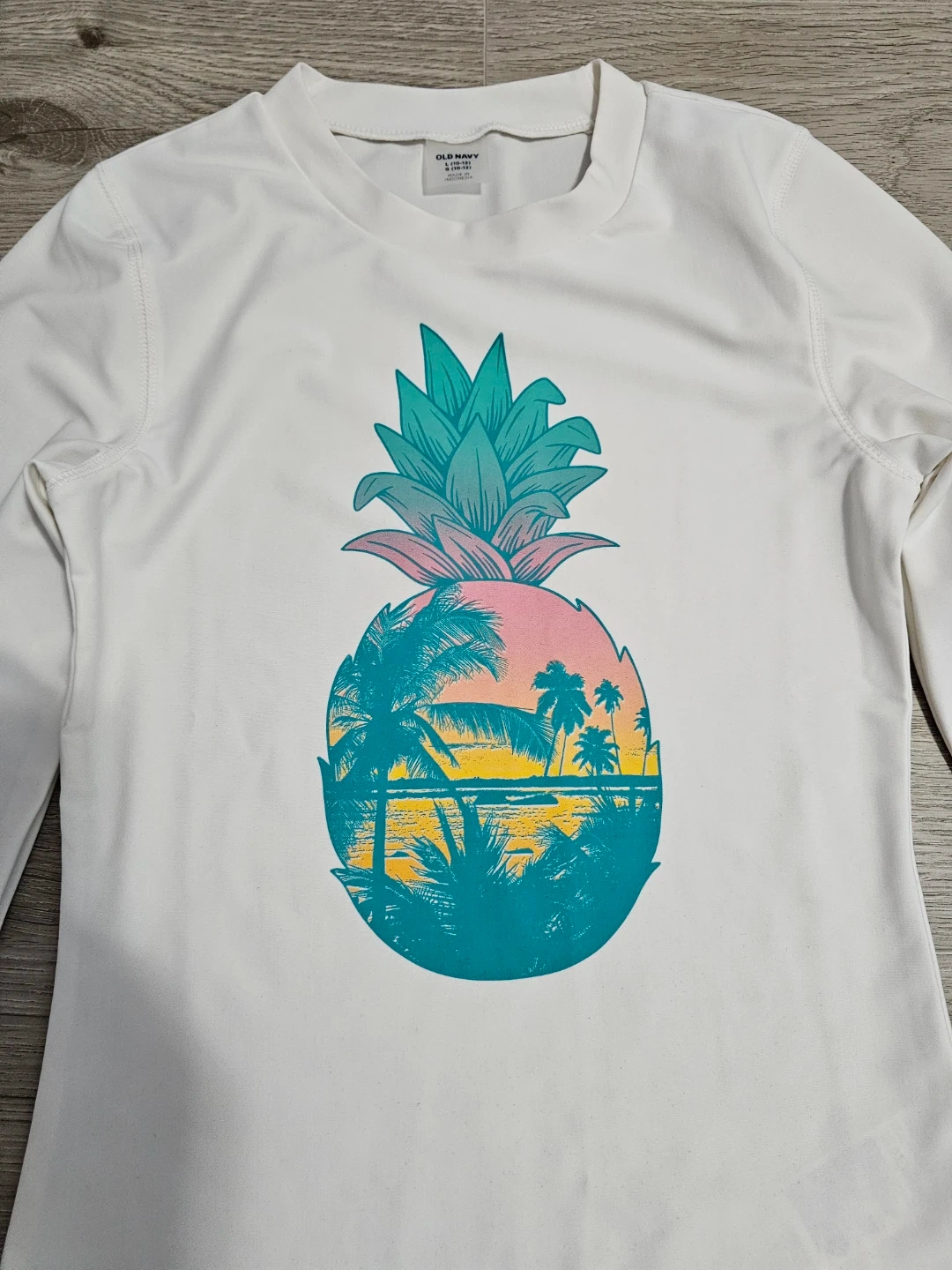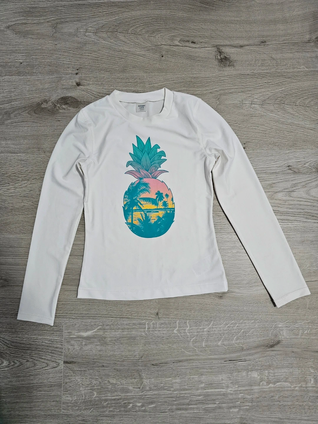This is a white Old Navy rash guard for girls. It features a colourful pineapple graphic with a tropical scene inside. The size is L, fitting 8-10 years old.perfect for beach/pool day.
