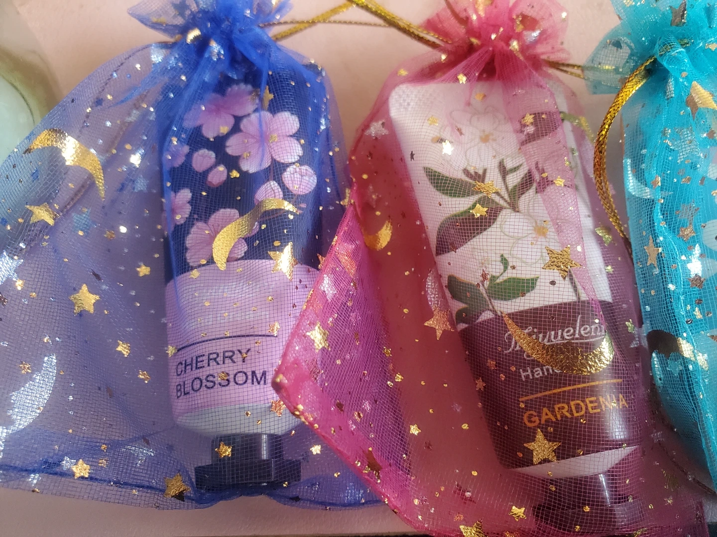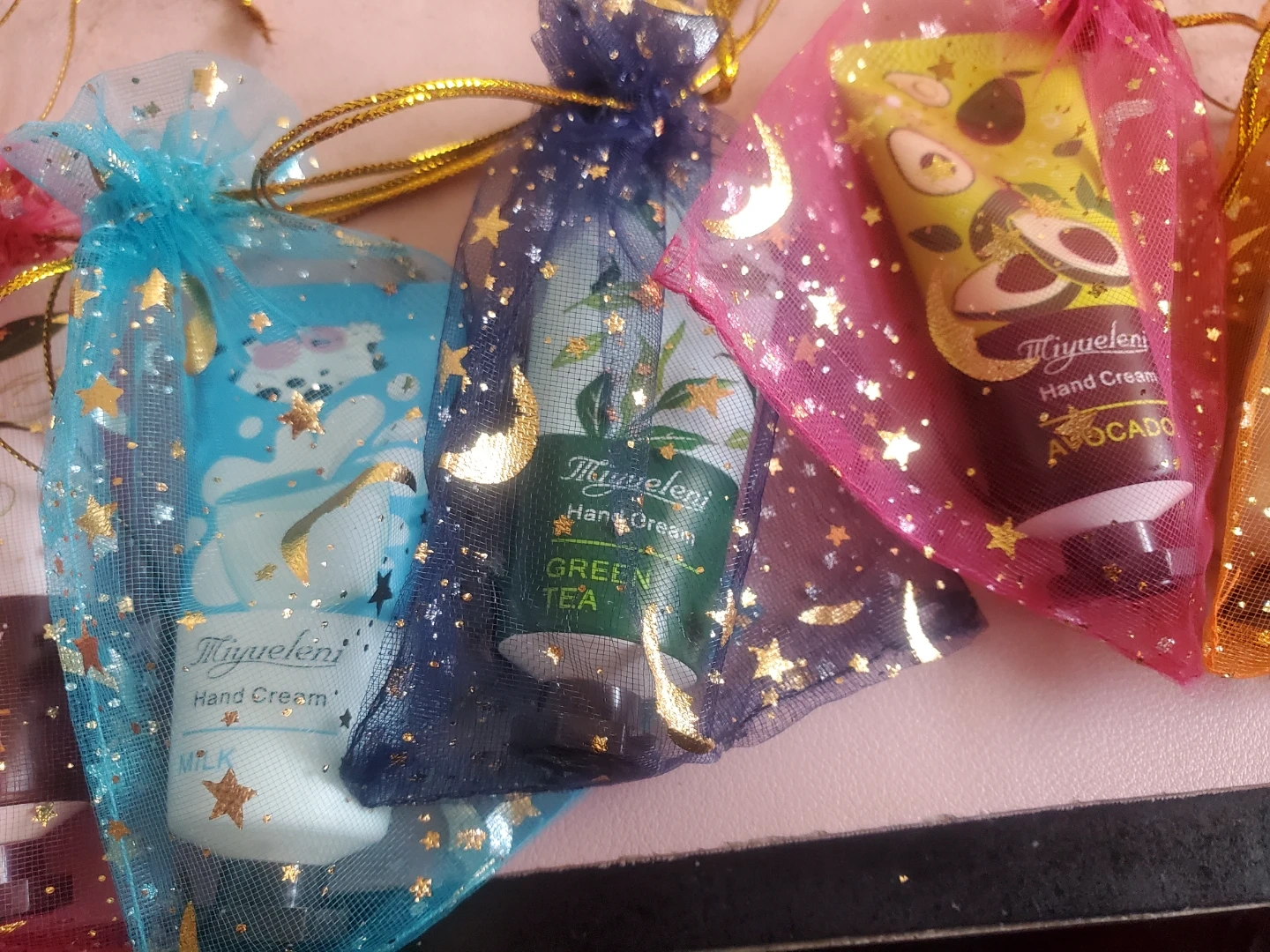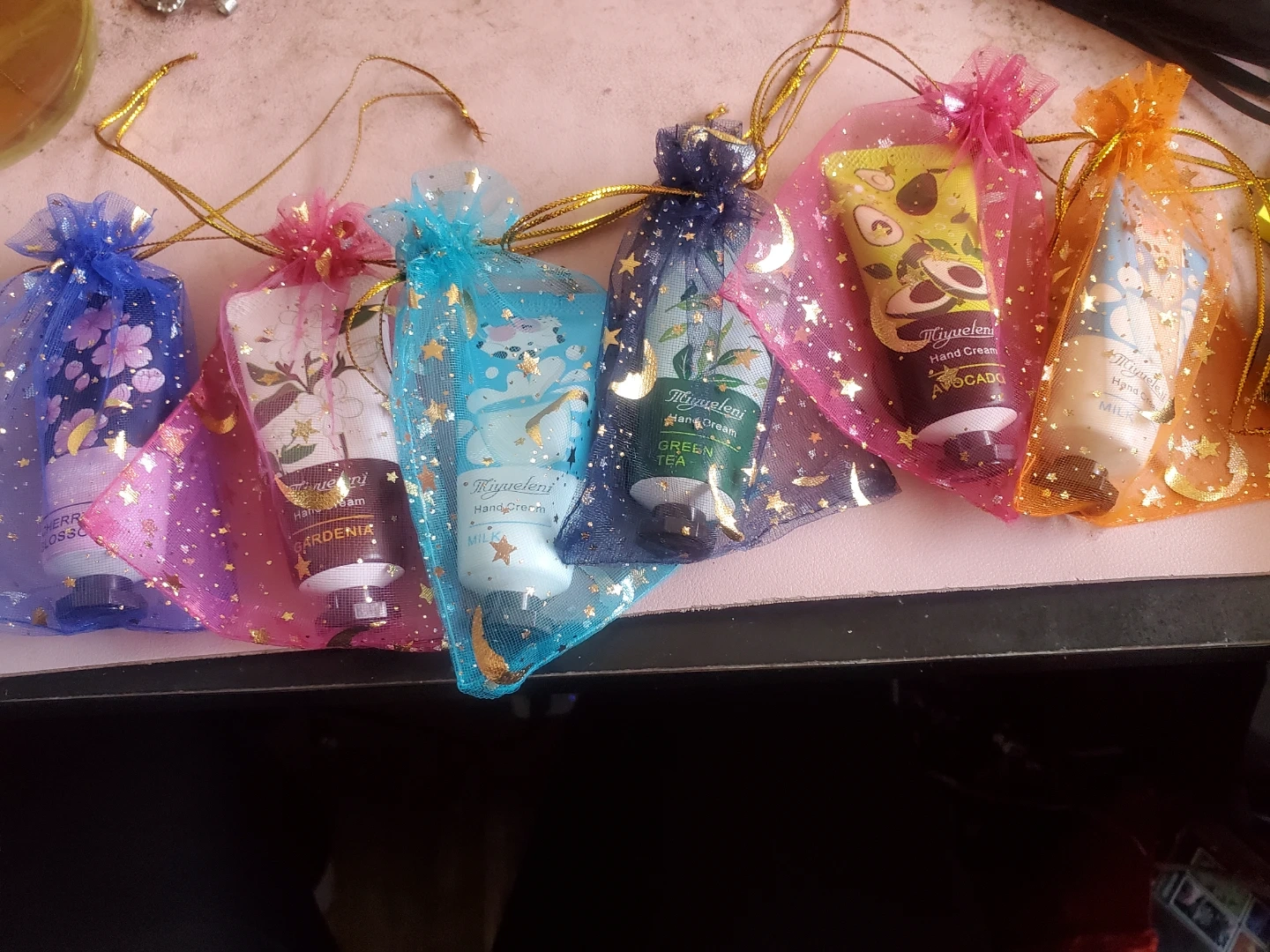 Get a set of 6 Miyueleni hand creams, each with a unique scent like Cherry Blossom, Gardenia, Green Tea, Milk, and Avocado. These little tubes are perfect for keeping your hands moisturized on the go. They come in cute, sheer organza bags, making them great for small gifts or party favours!